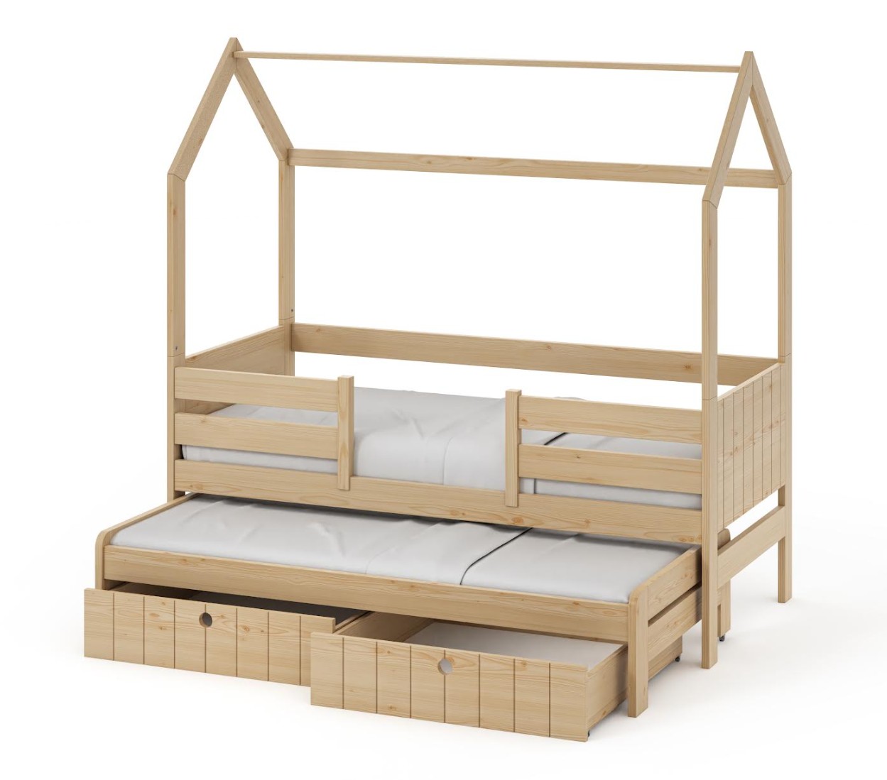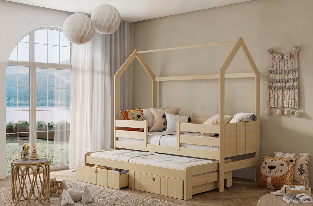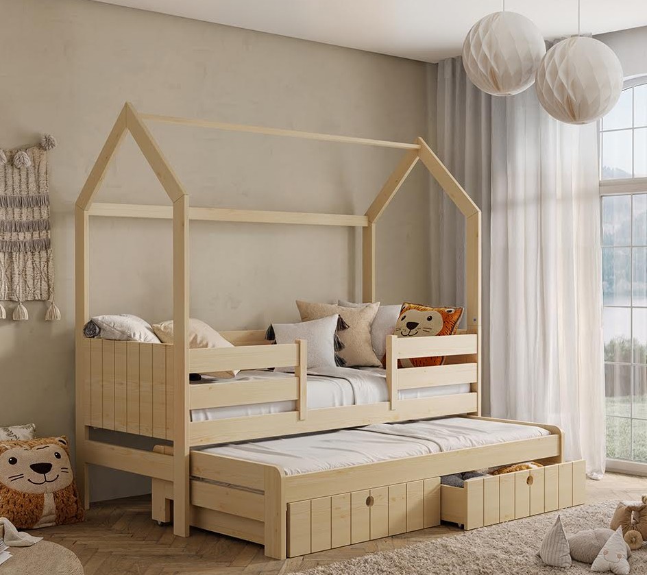 Detská domčeková posteľ z masívu borovice NOLAN II so šuplíkmi a prístelkou - 180x80 cm - prírodná borovica