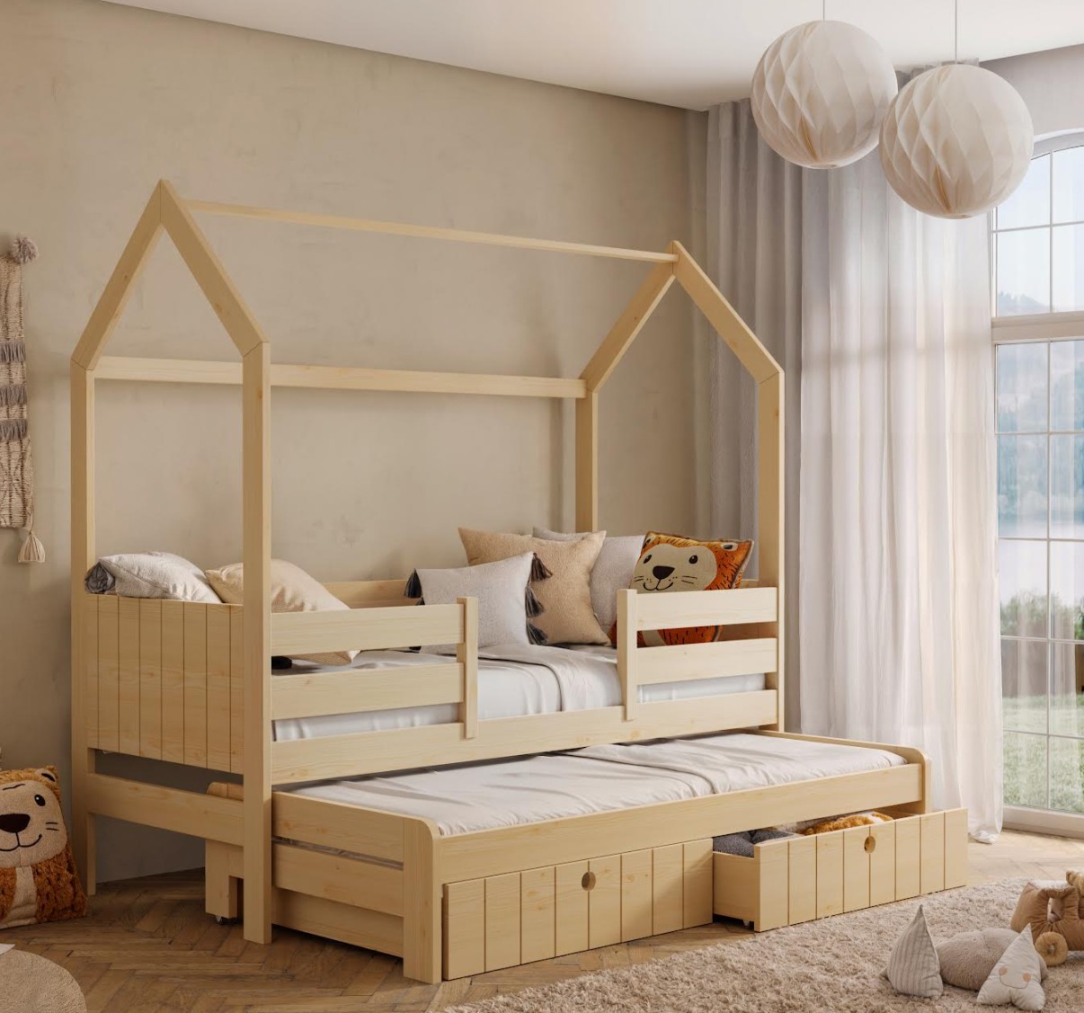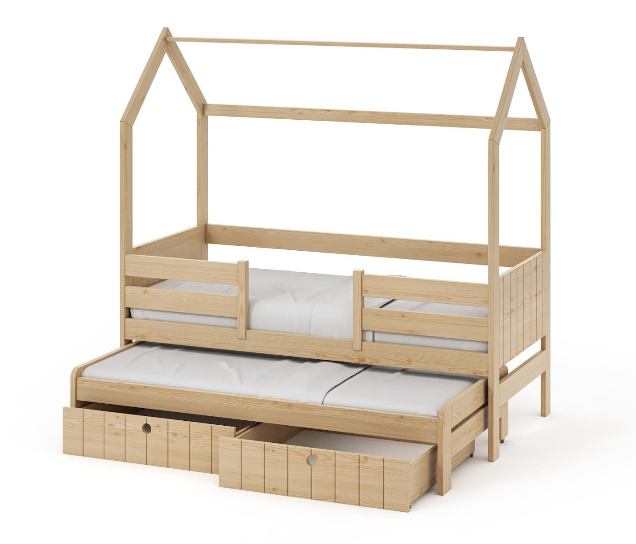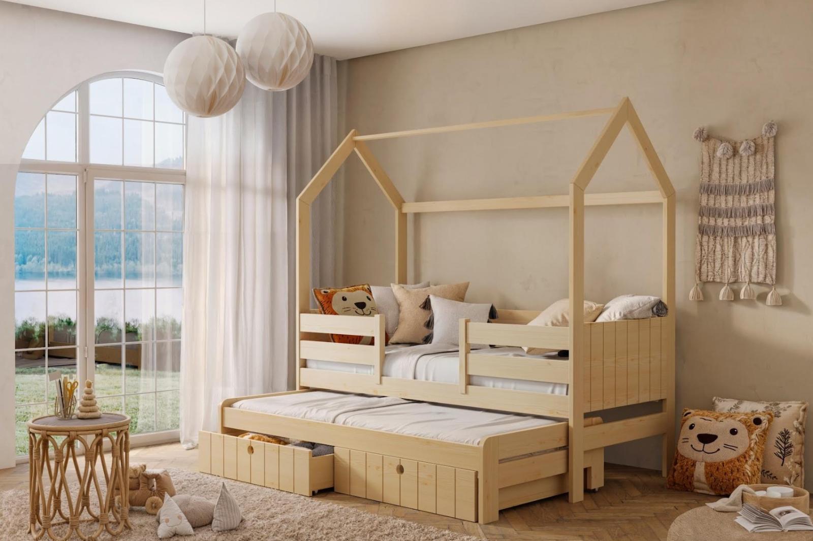 Detská domčeková posteľ z masívu borovice NOLAN so šuplíkmi a prístelkou - 180x80 cm - prírodná borovica