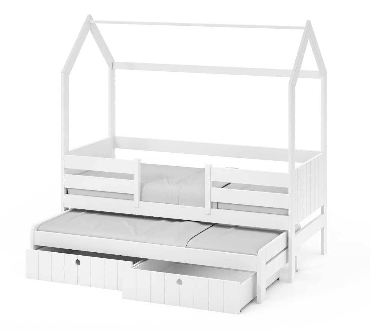 Detská domčeková posteľ z masívu borovice NOLAN so šuplíkmi a prístelkou - 200x90 cm - biela