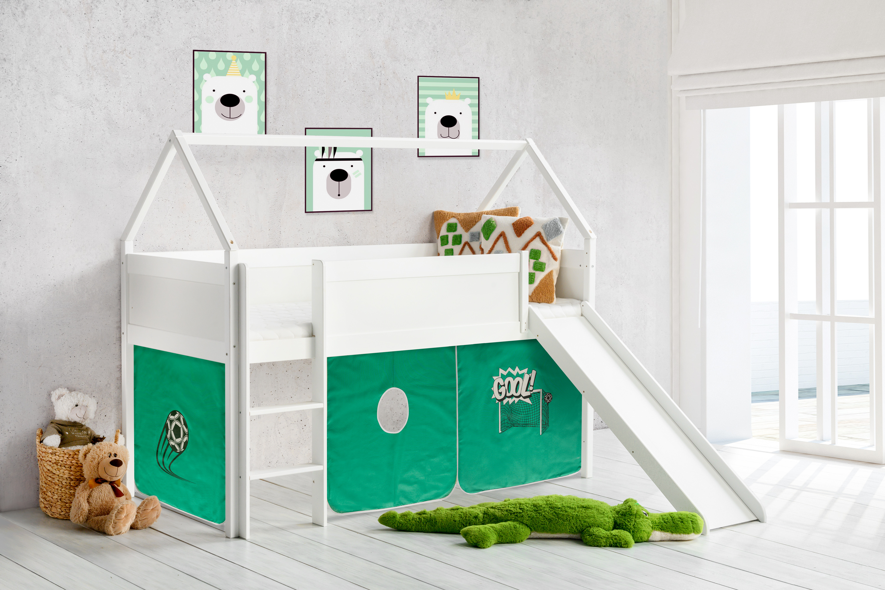 Detská domčeková VYVÝŠENÁ posteľ so šmykľavkou FUTBAL - 200x90 cm - BIELA