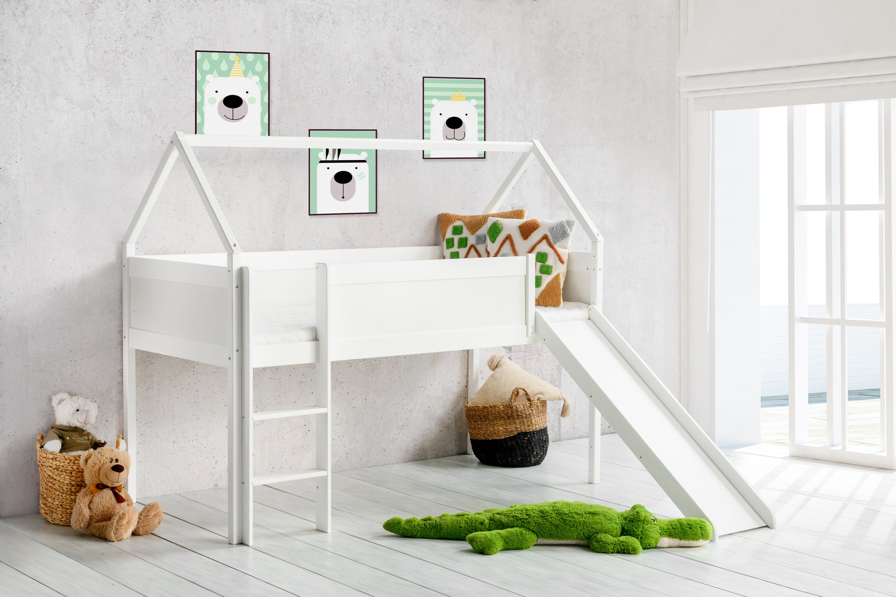 Vyvýšená posteľ pre deti - zaujímavá a moderná alternatíva ku klasickým detským posteliam . Vyvýšené detské postele svojou konštrukciou ponúkajú kombináciu pohodlného a bezpečného spánku na vyvýšenej posteli a priestoru na hranie. Vy tak kúpou takej postele získate kvalitnú posteľ a zároveň jedinečné miesto na hranie pre Vaše dieťa. Všetky typy vyvýšených postelí spĺňajú štandardy bezpečia Vašej ratolesti a skvele sa hodia do každej modernej domácnosti. Vybrať si u nás môžete vyvýšené postele s domčekom alebo napríklad vyvýšenú posteľ bez šmykľavky. Aby bolo zaistené bezpečie vášho dieťaťa, súčasťou postieľky je aj pevná zábrana z HDF dosky, ktorá ochráni vaše dieťa pred prípadným pádom. Posteľ je vyrobená z kvalitného borovicového dreva s ekologickým bielym náterom. Drevo postieľok je natreté ekologickým lakom. Časti postele sú zaoblené, tým pádom minimalizujú prípadné poranenia dieťaťa. Silný rošt pod matracom unesie váhu až 100 kg. Materiál aj celá posteľ spĺňajú všetky bezpečnostné normy. Rebrík aj šmykľavka sú univerzálne - sami si zvolíte umiestnenie počas montáže.