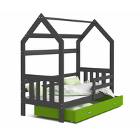 Detská Domčekové posteľ z pevného borovicového dreva sa stane krásnym dizajnovým prvkom v každom modernom izbe. Konštrukcia postele má ochrannú bariéru a vaše dieťa sa tak bude cítiť bezpečne. Ochranná bariéra možno pripevniť na pravú alebo ľavú stranu. Súčasťou tejto postele je tiež veľký priestranný šuflík na kolieskach vyrobený z vysoko kvalitných lamino dosiek, do ktorého si vaše dieťa bude môcť uschovávať svoje veci. Na túto posteľ bol použitý bezfarebný a bezzápachový lak, ktorý je bezpečný a ekologický.