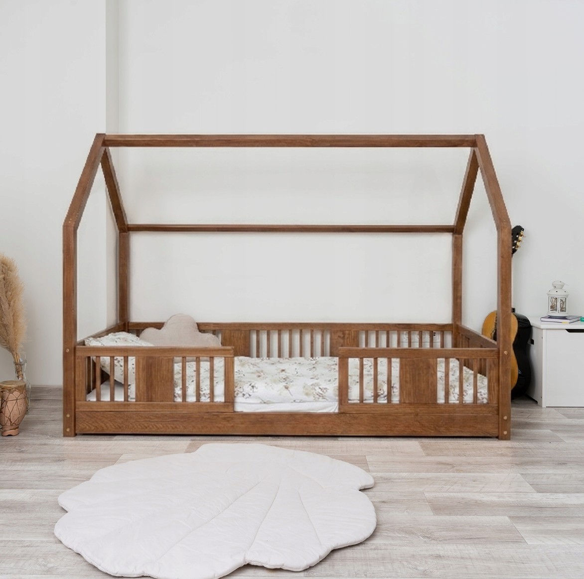 Montessori posteľ LUNA L je nízka detská posteľ v tvare domčeka určená pre najmenších, ktorí ešte len začínajú svoje dobrodružstvo so samostatným spánkom. Jej rám, umiestnený priamo na podlahe, minimalizuje riziko pádu a zároveň dáva dieťaťu pocit nezávislosti a bezpečia. Táto jednolôžková posteľ vytvára harmonický priestor pre pokojný spánok, prvé hranie a chvíle strávené s rodičmi pri čítaní rozprávok. Princíp Montessori kladie dôraz na voľnosť dieťaťa, čo táto posteľ ponúka. Je to perfektná voľba pre rodičov, ktorí hľadajú prvú posteľ pre svoje dieťa, kombinujúce estetiku, odolnosť a bezpečnosť v duchu štýlu Montessori. Posteľ LUNA je vyrobená z prírodného, lepeného borovicového dreva o sile 2,2 cm - materiálu, ktorý do každej miestnosti vnáša teplo, sviežosť a pokoj. Na povrchovú úpravu boli použité ekologické farby na vodnej báze, ktoré spĺňajú bezpečnostné normy. Posteľ ponúkame aj vo verzii bez povrchových úprav - nelakované drevo. Vďaka tomu sa dá ľahko prispôsobiť - jej vzhľad môžete upraviť morením, lakovaním alebo maľovaním podľa vlastného uváženia. Výrazné okrúhle lamely dodávajú posteli ľahký a príjemný pocit. Ich mäkký tvar robí posteľ decentnou a elegantnou a zároveň zostáva úplne bezpečná pre najmladších užívateľov. Dlhé drevené nebesá typu LONG dodáva posteli jedinečný, rozprávkový nádych. Ich pretiahnutý tvar vytvára dojem útulnej chalúpky, kde deti nielen spia, ale taktiež si vymýšľajú vlastné hry a príbehy. Je to ideálne miesto pre ich fantáziu - len pár vankúšov, nebesia alebo niekoľko lampičiek dokáže premeniť posteľ na kúzelný detský kútik. Každý prvok rámu bol precízne vyleštený a hrany sú jemne zaoblené, aby bolo zaistené maximálne pohodlie a bezpečnosť. Bezpečnostné zábrany pri vstupe do postele sú odnímateľné.