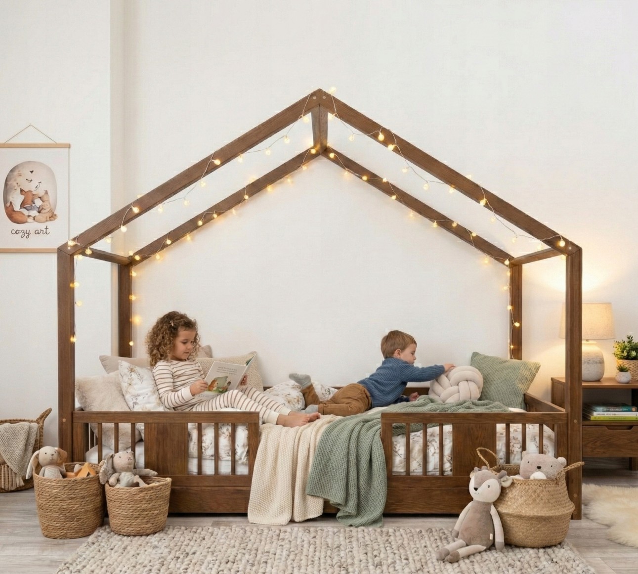 Montessori posteľ LUNA S je očarujúce jednolôžko v tvare domčeka, ktoré kombinuje funkčnosť, bezpečnosť a nadčasovú estetiku. Postavené priamo na podlahu vytvára bezpečný priestor, ideálny ako prvá detská postieľka. Vďaka nízkemu profilu môže vaše dieťa samostatne vliezť a vstávať z postele, čo podporuje jeho vývoj a nezávislosť od útleho veku. Princíp Montessori kladie dôraz na voľnosť dieťaťa, čo táto posteľ ponúka. Charakteristickým rysom modelu LUNA sú okrúhle, sústružené priečky, ktoré dodávajú posteli jemný, príjemný vzhľad a nenápadne ju odlišujú od ostatných modelov. Ich mäkký tvar vnáša do interiéru harmóniu a ľahkosť a zároveň poskytuje dodatočné bezpečie počas spánku. Posteľ LUNA S je vyrobená výhradne z prírodného borovicového dreva o sile 2,2 cm – odolného, prírodného a úplne bezpečného pre deti. Každý kus má zaoblené hrany na pohodlné používanie. Na povrchovú úpravu boli použité ekologické farby na vodnej báze, ktoré spĺňajú bezpečnostné normy. Posteľ ponúkame aj vo verzii bez povrchových úprav - nelakované drevo. Vďaka tomu sa dá ľahko prispôsobiť - jej vzhľad môžete upraviť morením, lakovaním alebo maľovaním podľa vlastného uváženia. Unikátny drevený baldachýn vytvára útulnú, rozprávkovú atmosféru. Stačí pridať svetlá alebo ľahkú látku a premeniť obyčajnú izbu na kúzelný priestor. Táto posteľ nie je len na spanie, ale aj na vytváranie spomienok.