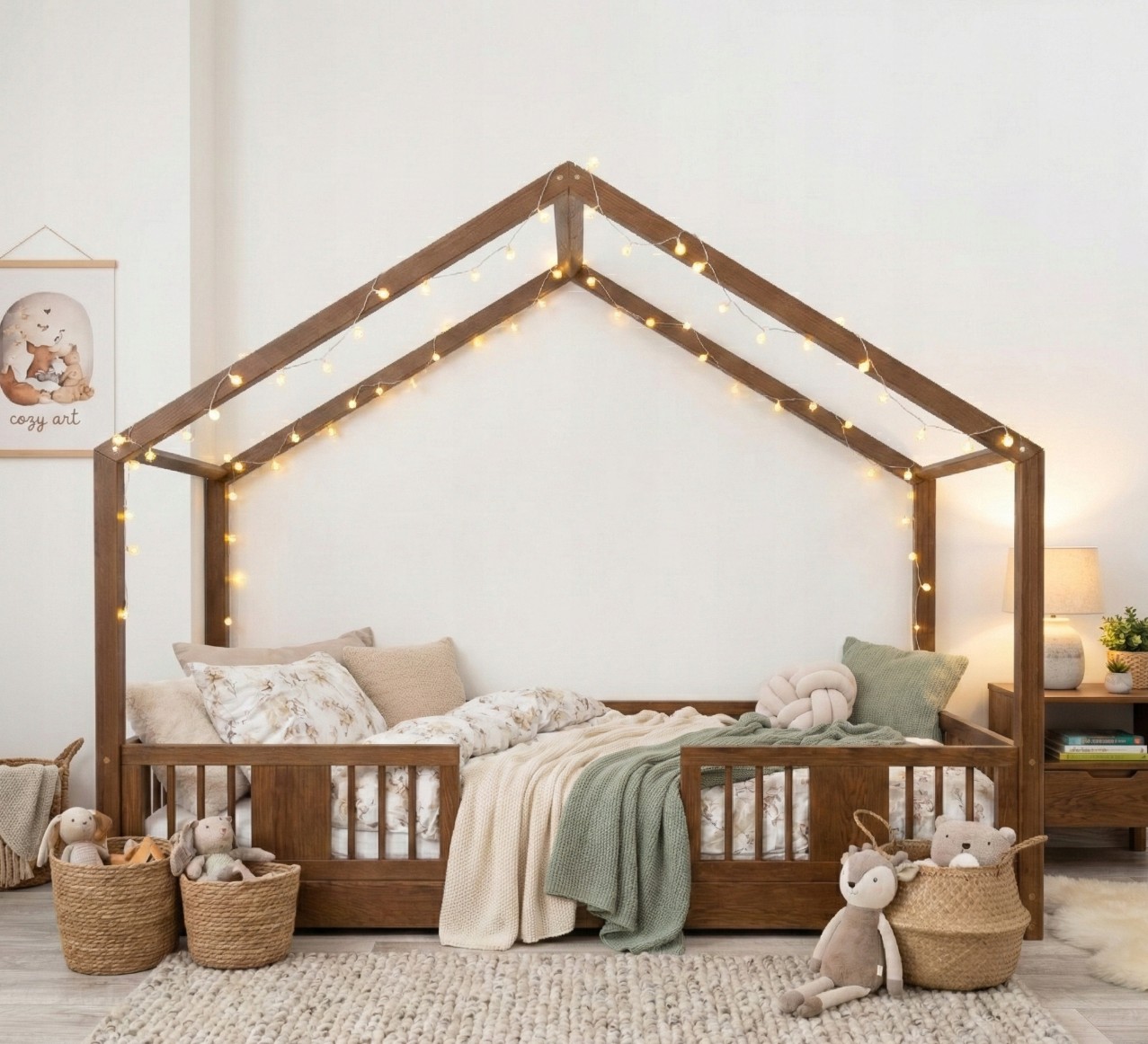 Montessori posteľ LUNA S je očarujúce jednolôžko v tvare domčeka, ktoré kombinuje funkčnosť, bezpečnosť a nadčasovú estetiku. Postavené priamo na podlahu vytvára bezpečný priestor, ideálny ako prvá detská postieľka. Vďaka nízkemu profilu môže vaše dieťa samostatne vliezť a vstávať z postele, čo podporuje jeho vývoj a nezávislosť od útleho veku. Princíp Montessori kladie dôraz na voľnosť dieťaťa, čo táto posteľ ponúka. Charakteristickým rysom modelu LUNA sú okrúhle, sústružené priečky, ktoré dodávajú posteli jemný, príjemný vzhľad a nenápadne ju odlišujú od ostatných modelov. Ich mäkký tvar vnáša do interiéru harmóniu a ľahkosť a zároveň poskytuje dodatočné bezpečie počas spánku. Posteľ LUNA S je vyrobená výhradne z prírodného borovicového dreva o sile 2,2 cm – odolného, prírodného a úplne bezpečného pre deti. Každý kus má zaoblené hrany na pohodlné používanie. Na povrchovú úpravu boli použité ekologické farby na vodnej báze, ktoré spĺňajú bezpečnostné normy. Posteľ ponúkame aj vo verzii bez povrchových úprav - nelakované drevo. Vďaka tomu sa dá ľahko prispôsobiť - jej vzhľad môžete upraviť morením, lakovaním alebo maľovaním podľa vlastného uváženia. Unikátny drevený baldachýn vytvára útulnú, rozprávkovú atmosféru. Stačí pridať svetlá alebo ľahkú látku a premeniť obyčajnú izbu na kúzelný priestor. Táto posteľ nie je len na spanie, ale aj na vytváranie spomienok.
