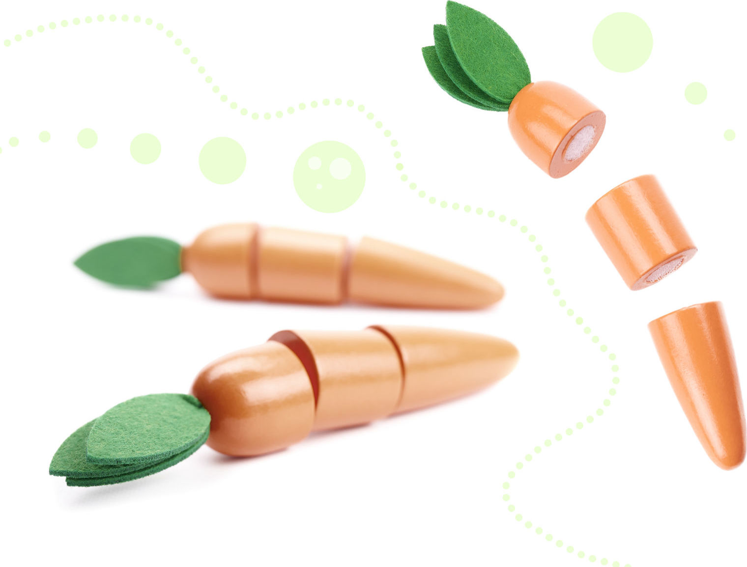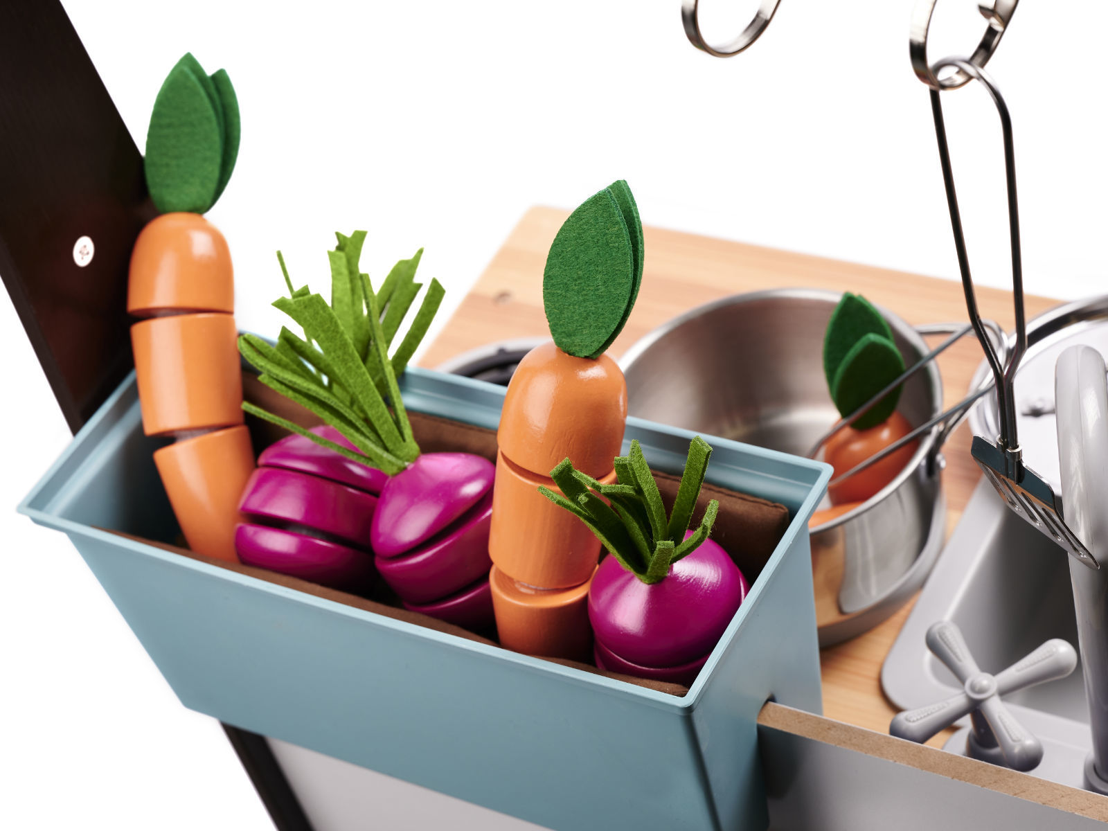 V sade nájdete kovovú panvicu, hrniec s pokrievkou, drevený nôž a ďalšie potrebné prvky, aby malý kuchár mohol uvariť skutočné kulinárske dielo. Realisticky vyzerajúca mrkva a reďkovky, ktoré sa dajú krájať ako skutočná zelenina, navyše skvele spestrí hru a poskytnú vášmu dieťaťu veľa zábavy. Kuchynská linka je navyše vybavená rúrou s otváracími dvierkami, skrinkou, látkovými organizérmi, ktoré imitujú zásuvky, a batériou s drezom.