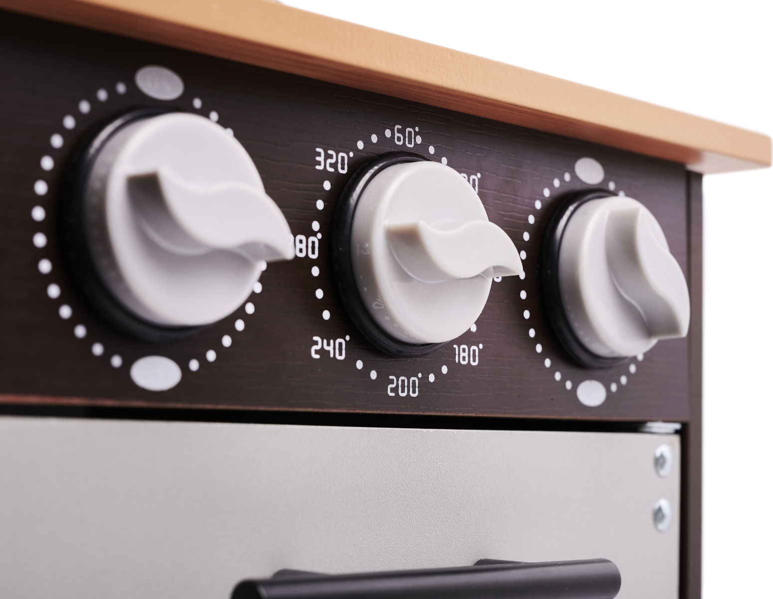 Ako v každej modernej kuchyni je aj tu chladnička s výrobníkom kociek ľadu, ktorý vydáva zvuky podobné skutočnému spotrebiču. Hra s kuchyňou je nielen skvelou zábavou, ale aj zámienkou na učenie sa základným domácim prácam. Vaše dieťa sa naučí základným úkonom pri varení, servírovaní jedál a udržiavaní poriadku. Drevená kuchynka vám umožní vysvetliť dieťaťu nebezpečenstvo horákov a obsluhu rúry bez rizika popálenia.
