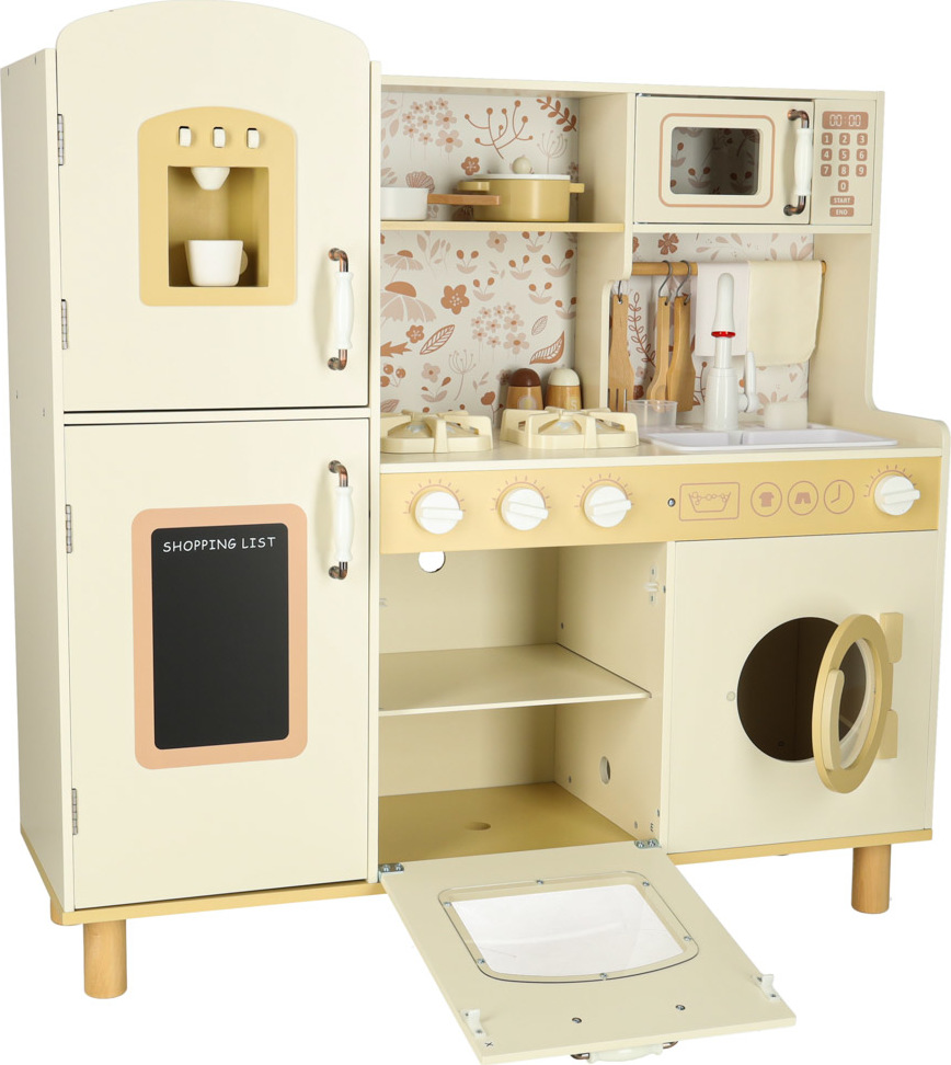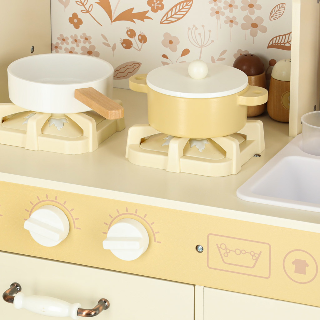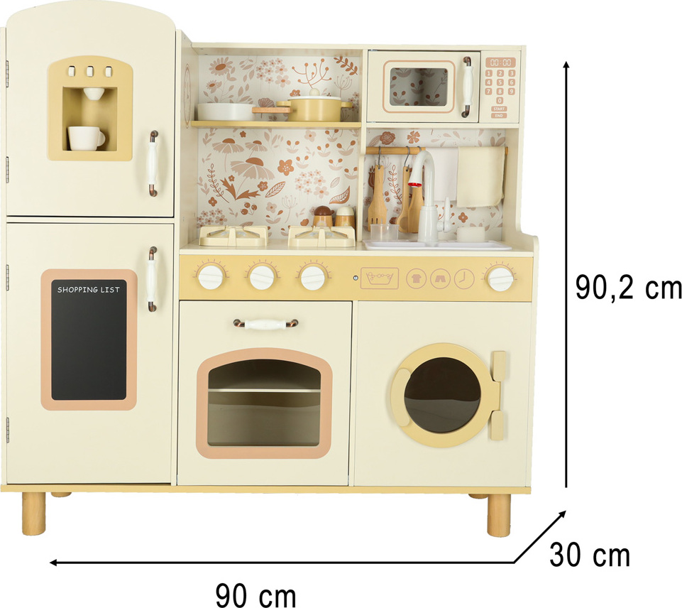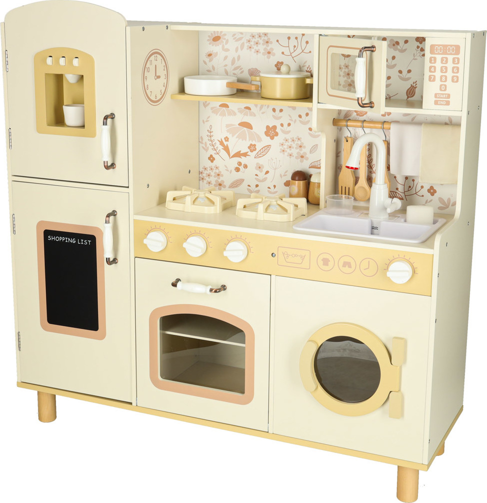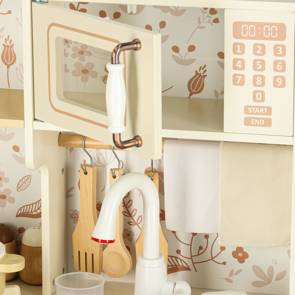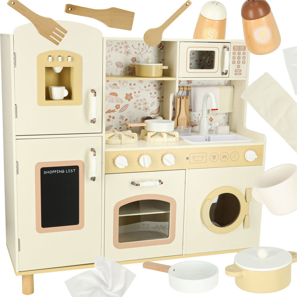 Súčasťou drevenej detskej kuchynky je príslušenstvo, ako je hrnček, hrniec, panvica, kuchynské špachtle, soľnička a korenička, ďalej práčka, mikrovlnná rúra, rúra, drez s funkciou vylievania a úložné skrinky. Vďaka tomu sa kreatívna hra stane každodennou činnosťou a dieťa sa naučí voľne sa pohybovať a udržiavať svoj kuchynský priestor v poriadku.