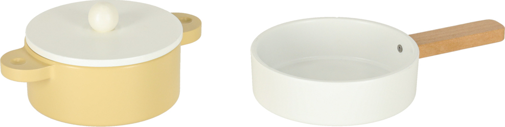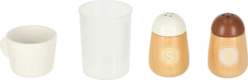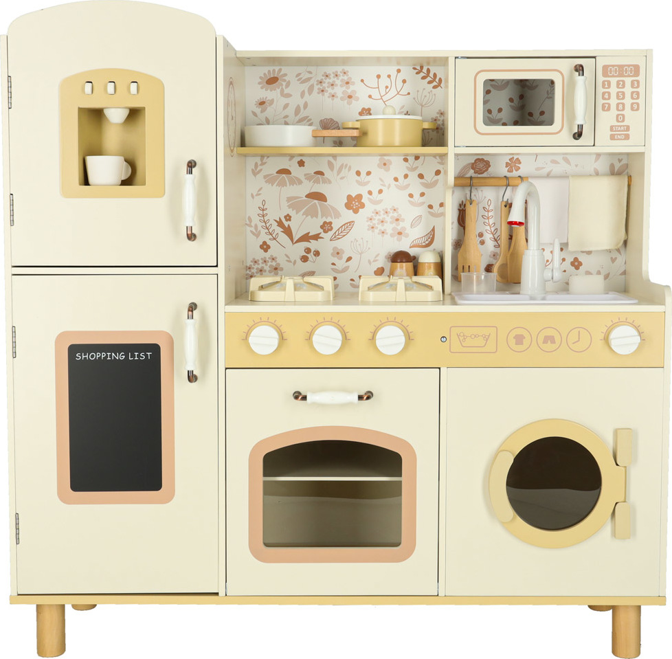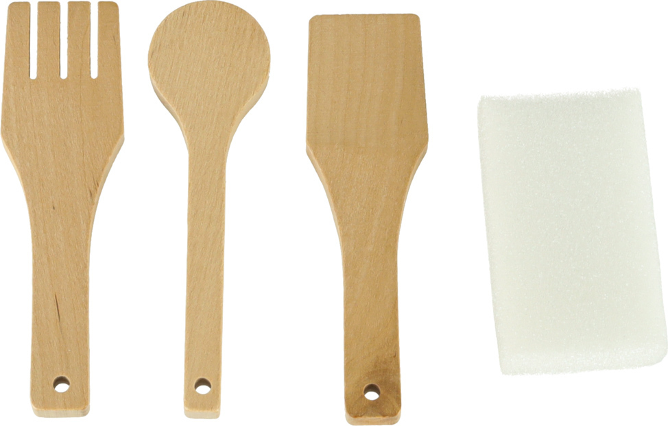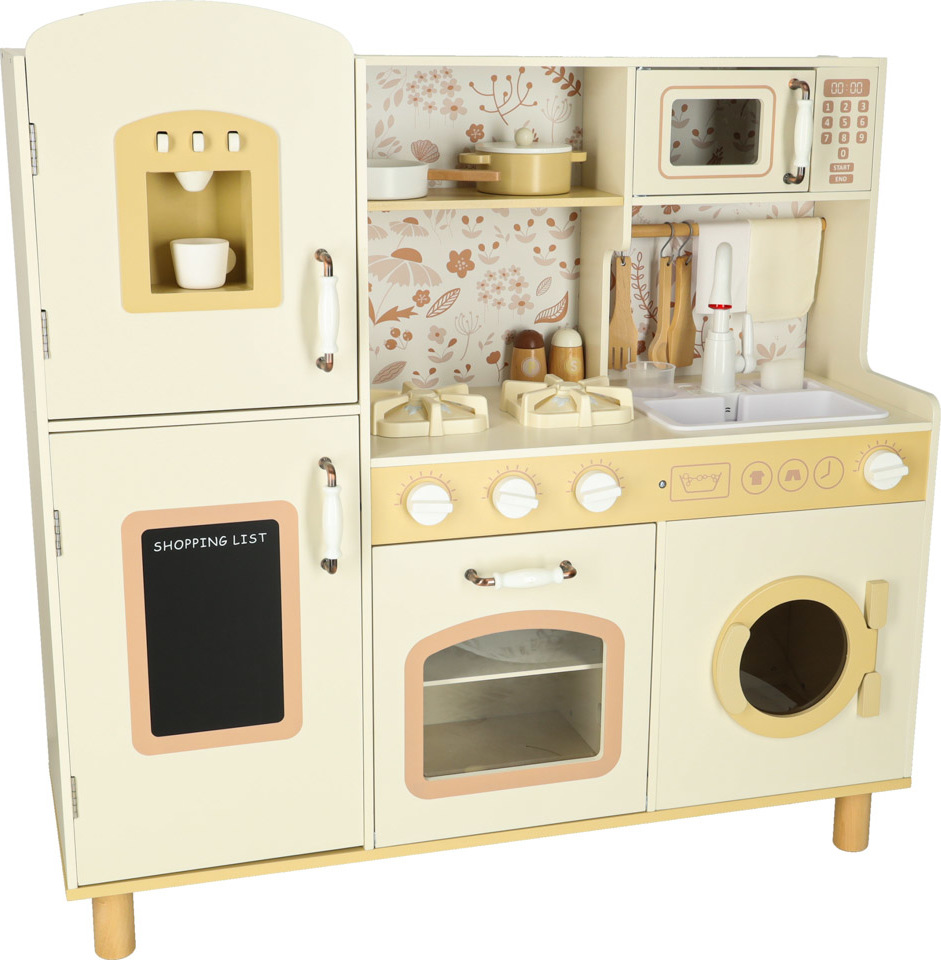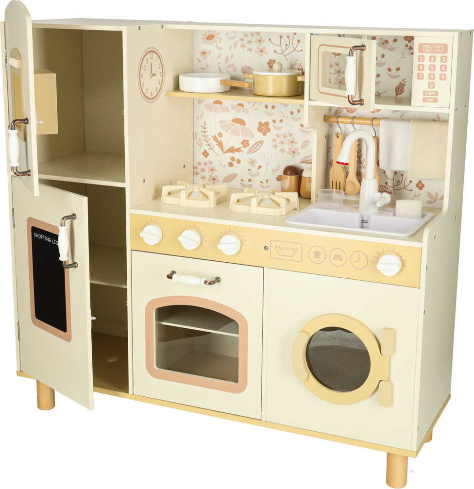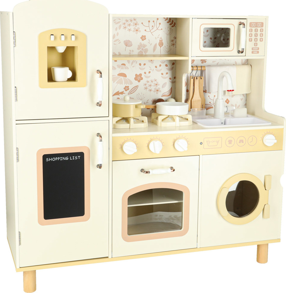 Súčasťou drevenej detskej kuchynky je príslušenstvo, ako je hrnček, hrniec, panvica, kuchynské špachtle, soľnička a korenička, ďalej práčka, mikrovlnná rúra, rúra, drez s funkciou vylievania a úložné skrinky. Vďaka tomu sa kreatívna hra stane každodennou činnosťou a dieťa sa naučí voľne sa pohybovať a udržiavať svoj kuchynský priestor v poriadku.