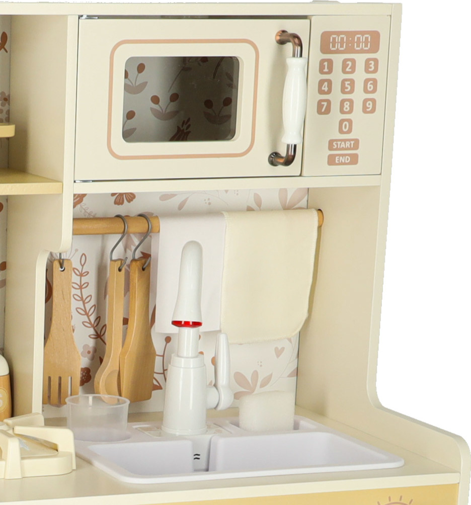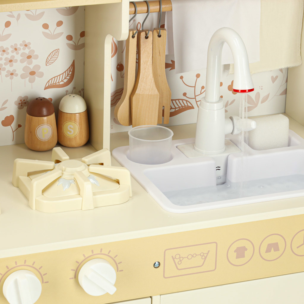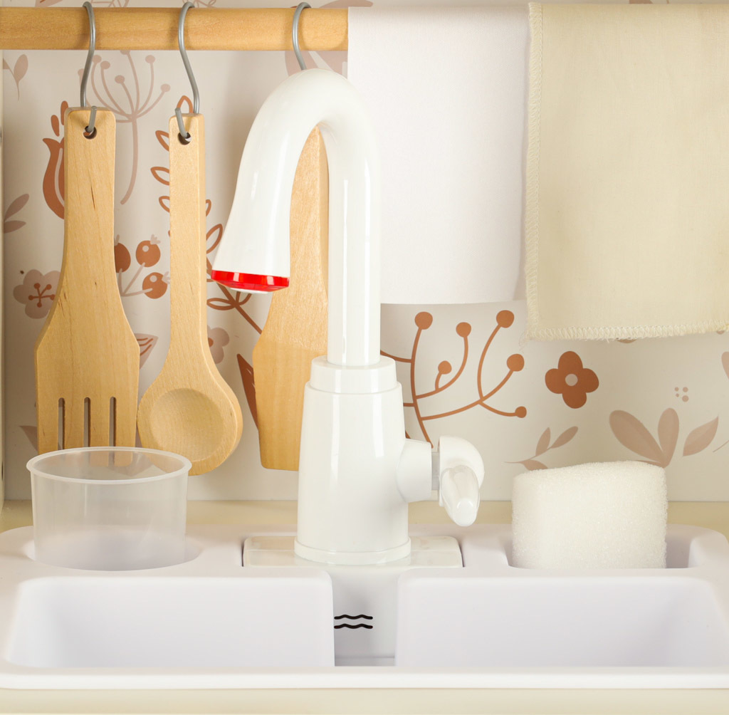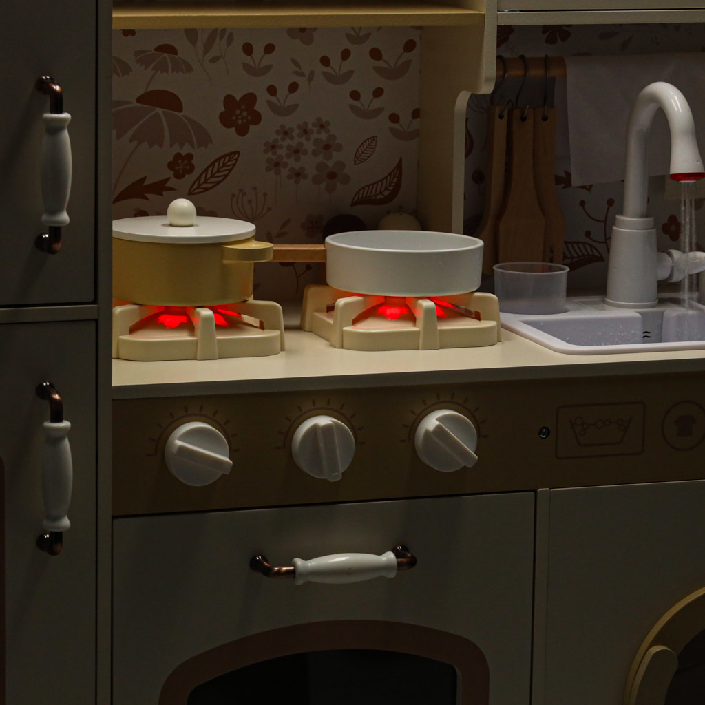 - Drevená kuchynka je vybavená interaktívnymi prvkami - svietiacimi horákmi, realistickými zvukmi pri varení, kohútikom s prúdom vody, vďaka čomu sa hra stáva realistickým dobrodružstvom v reálnom živote