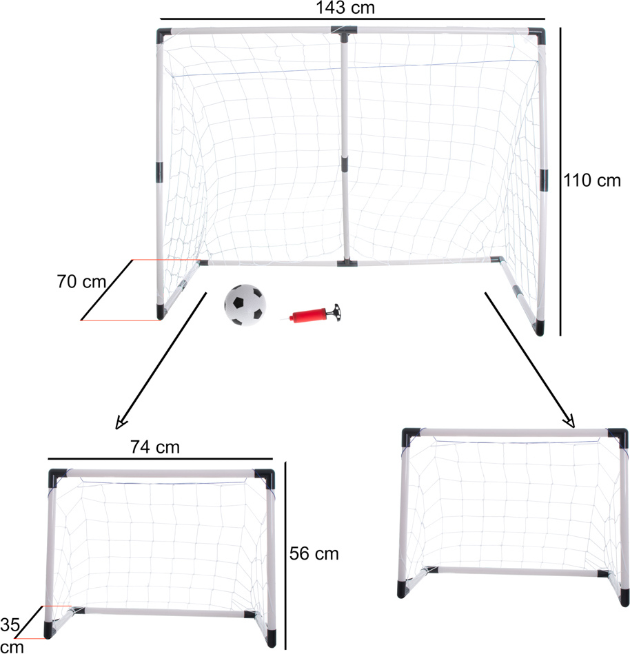 Hrá vaše dieťa rado futbal, ale na záhrade ešte nemáte bránky? Odporúčame zakúpenie tejto unikátnej futbalovej bránky. Čo presne však tento gól odlišuje od ostatných? Možnosť vytvoriť z dostupných dielov jeden väčší gól alebo dve menšie ! Naozaj praktické riešenie! Pokiaľ si vaše deti chcú zahrať zápas, budú sa im hodiť dva góly, zatiaľ čo pre tréning strieľania gólov môže byť oveľa užitočnejší jeden väčší gól! Veľká bránka meria 143 cm x 110 cm x 70 cm, zatiaľ čo jedna menšia bránka meria 74 cm x 55 cm x 35 cm.