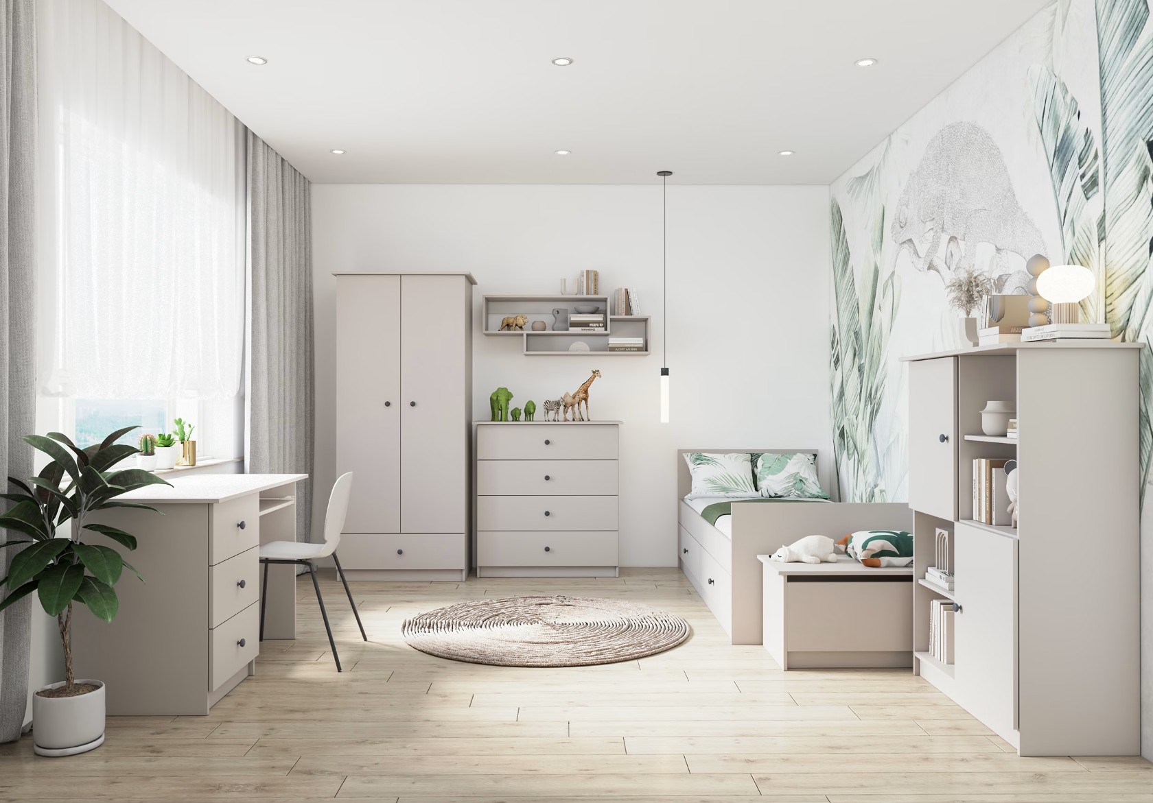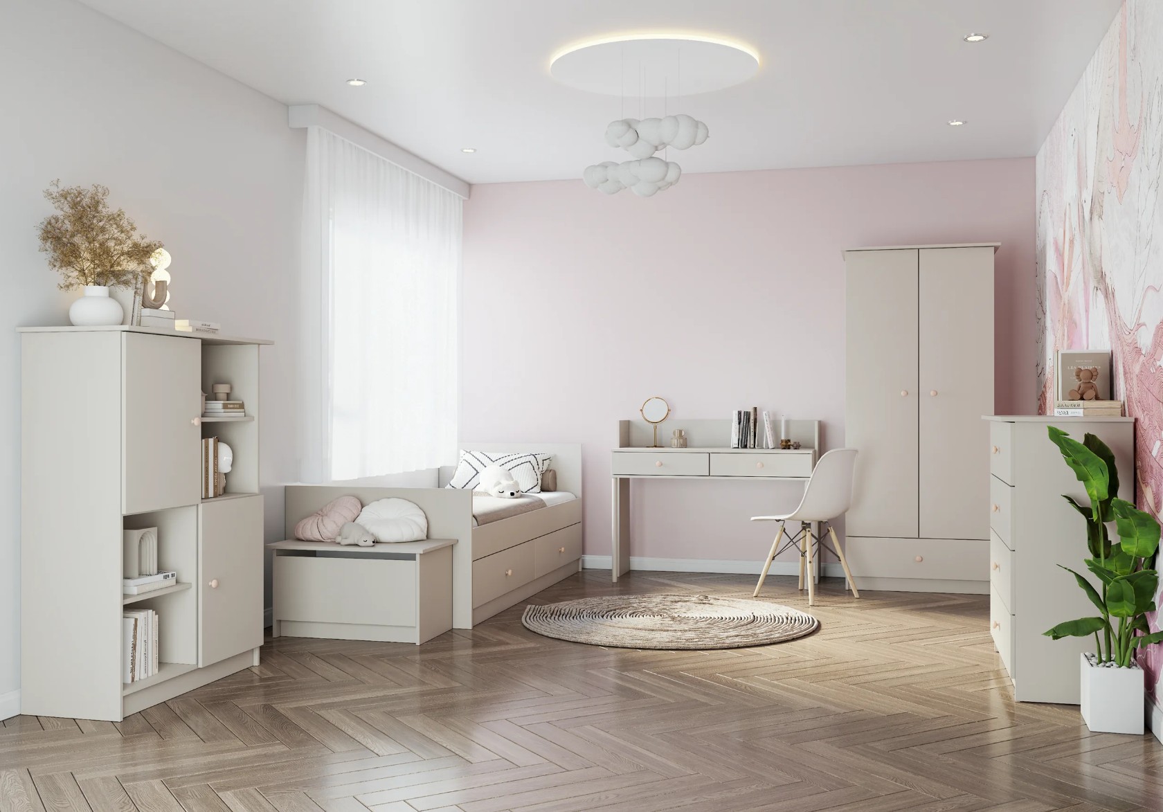 Kolekcia je dostupná v elegantnej bielej alebo modernej kašmírovej farbe, ktoré dopĺňajú farebne zladené úchyty v ružovom alebo antracitovom prevedení. Výsledkom je útulný, praktický a designovo vyvážený priestor, kde sa deti budú cítiť príjemne pri hre, učení aj odpočinku.