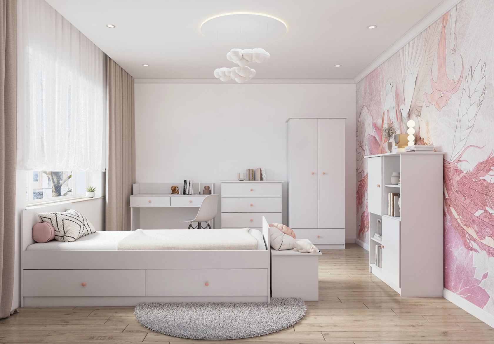 Kolekcia je dostupná v elegantnej bielej alebo modernej kašmírovej farbe, ktoré dopĺňajú farebne zladené úchyty v ružovom alebo antracitovom prevedení. Výsledkom je útulný, praktický a designovo vyvážený priestor, kde sa deti budú cítiť príjemne pri hre, učení aj odpočinku.