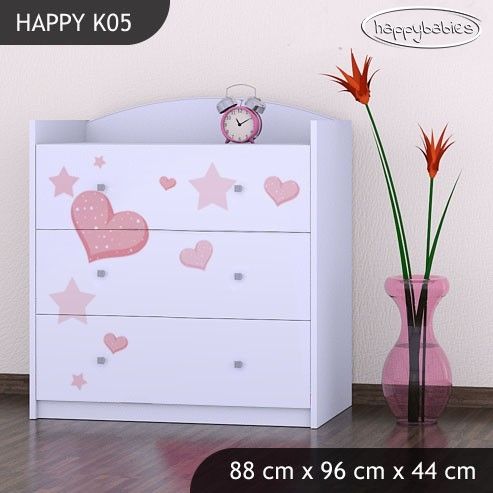 Detské komody patrí do každej detskej izby. Komody sú nielen krásne, ale hlavne praktické. Deťom slúži na uloženie oblečenia, najrôznejších hračiek a drobností a učí ich poriadku. Ponúkame Vám krásnu detskú komodu s tromi zásuvkami, ktorá je vyrobená z vysoko kvalitnej lamino dosky a na čelách šuplíkov má krásny farebná potlač, ktorý sa Vášmu dieťaťu určite zapáči.