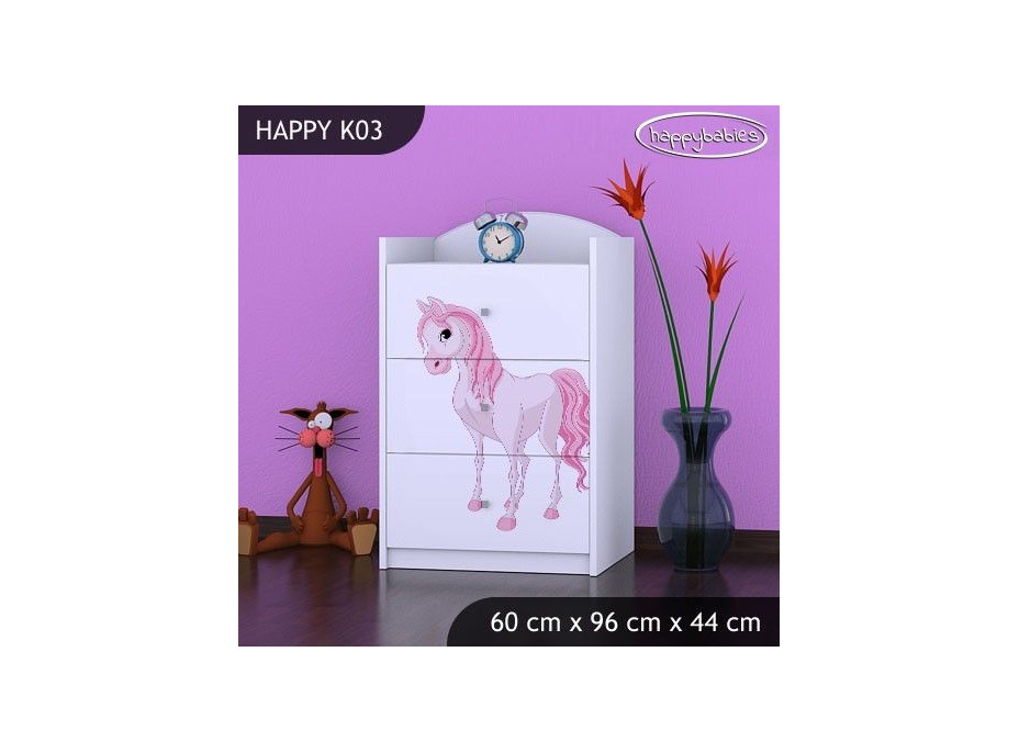 Detské komody patrí do každej detskej izby. Komody sú nielen krásne, ale hlavne praktické. Deťom slúži na uloženie oblečenia, najrôznejších hračiek a drobností a učí ich poriadku. Ponúkame Vám krásnu detskú komodu s tromi zásuvkami, ktorá je vyrobená z vysoko kvalitnej lamino dosky a na čelách šuplíkov má krásny farebná potlač, ktorý sa Vášmu dieťaťu určite zapáči. Vybrať si môžete aj farbu nábytku.