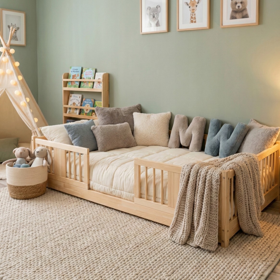 Montessori posteľ LUNA je unikátna nízka detská posteľ s guľatými latkami, navrhnutá s ohľadom na najmladších užívateľov. Vďaka výške 0 cm sa rám dotýka podlahy, čo deťom umožňuje samostatné vstávanie a lezenie z postele a bezpečne ich učí samostatnosti. Princíp Montessori kladie dôraz na voľnosť dieťaťa, čo táto posteľ ponúka. Je to perfektná voľba pre rodičov, ktorí hľadajú prvú posteľ pre svoje dieťa, kombinujúce estetiku, odolnosť a bezpečnosť v duchu štýlu Montessori. Posteľ LUNA je vyrobená výhradne z prírodného borovicového dreva o sile 2,2 cm pochádzajúceho z certifikovaných zdrojov. Prírodné drevo nielenže vyzerá krásne, ale je tiež úplne bezpečné - bez toxínov a pachov. Povrch postele je natretý ekologickými farbami na vodnej báze, ktoré spĺňajú prísne európske bezpečnostné normy EN 71-3. To znamená, že si môžete byť istí, že posteľ je vhodná aj pre najmenšie deti a alergikov. Posteľ ponúkame aj vo verzii bez povrchových úprav - nelakované drevo. Vďaka tomu sa dá ľahko prispôsobiť - jej vzhľad môžete upraviť morením, lakovaním alebo maľovaním podľa vlastného uváženia. Každý prvok rámu bol precízne vyleštený a hrany sú jemne zaoblené, aby bolo zaistené maximálne pohodlie a bezpečnosť. Bezpečnostné zábrany pri vstupe do postele sú odnímateľné.