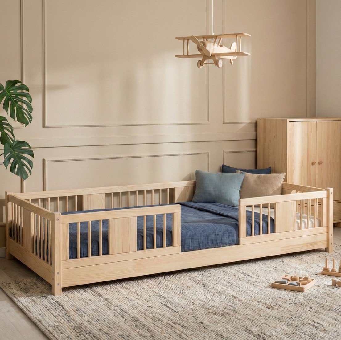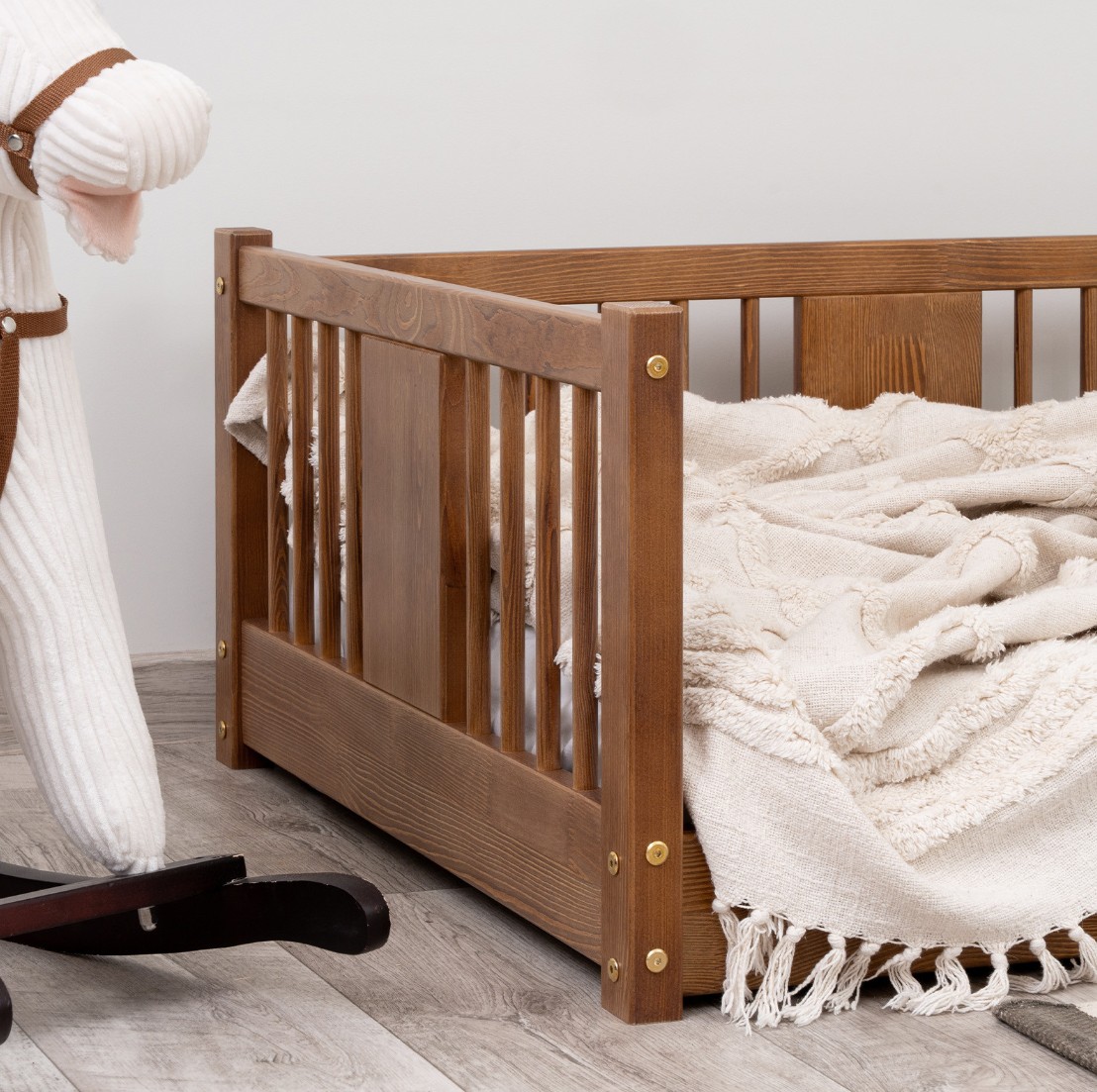 Montessori posteľ LUNA je unikátna nízka detská posteľ s okrúhlymi latkami, navrhnutá s ohľadom na najmladších užívateľov. Vďaka výške 0 cm sa rám dotýka podlahy, čo deťom umožňuje samostatné vstávanie a lezenie z postele a bezpečne ich učí samostatnosti. Princíp Montessori kladie dôraz na voľnosť dieťaťa, čo táto posteľ ponúka. Je to perfektná voľba pre rodičov, ktorí hľadajú prvú posteľ pre svoje dieťa, kombinujúce estetiku, odolnosť a bezpečnosť v duchu štýlu Montessori. Posteľ LUNA je vyrobená výhradne z prírodného borovicového dreva o sile 2,2 cm pochádzajúceho z certifikovaných zdrojov. Prírodné drevo nielenže vyzerá krásne, ale je tiež úplne bezpečné - bez toxínov a pachov. Povrch postele je natretý ekologickými farbami na vodnej báze, ktoré spĺňajú prísne európske bezpečnostné normy EN 71-3. To znamená, že si môžete byť istí, že posteľ je vhodná aj pre najmenšie deti a alergikov. Posteľ ponúkame aj vo verzii bez povrchových úprav - nelakované drevo. Vďaka tomu sa dá ľahko prispôsobiť - jej vzhľad môžete upraviť morením, lakovaním alebo maľovaním podľa vlastného uváženia. Každý prvok rámu bol precízne vyleštený a hrany sú jemne zaoblené, aby bolo zaistené maximálne pohodlie a bezpečnosť. Bezpečnostné zábrany pri vstupe do postele sú odnímateľné.