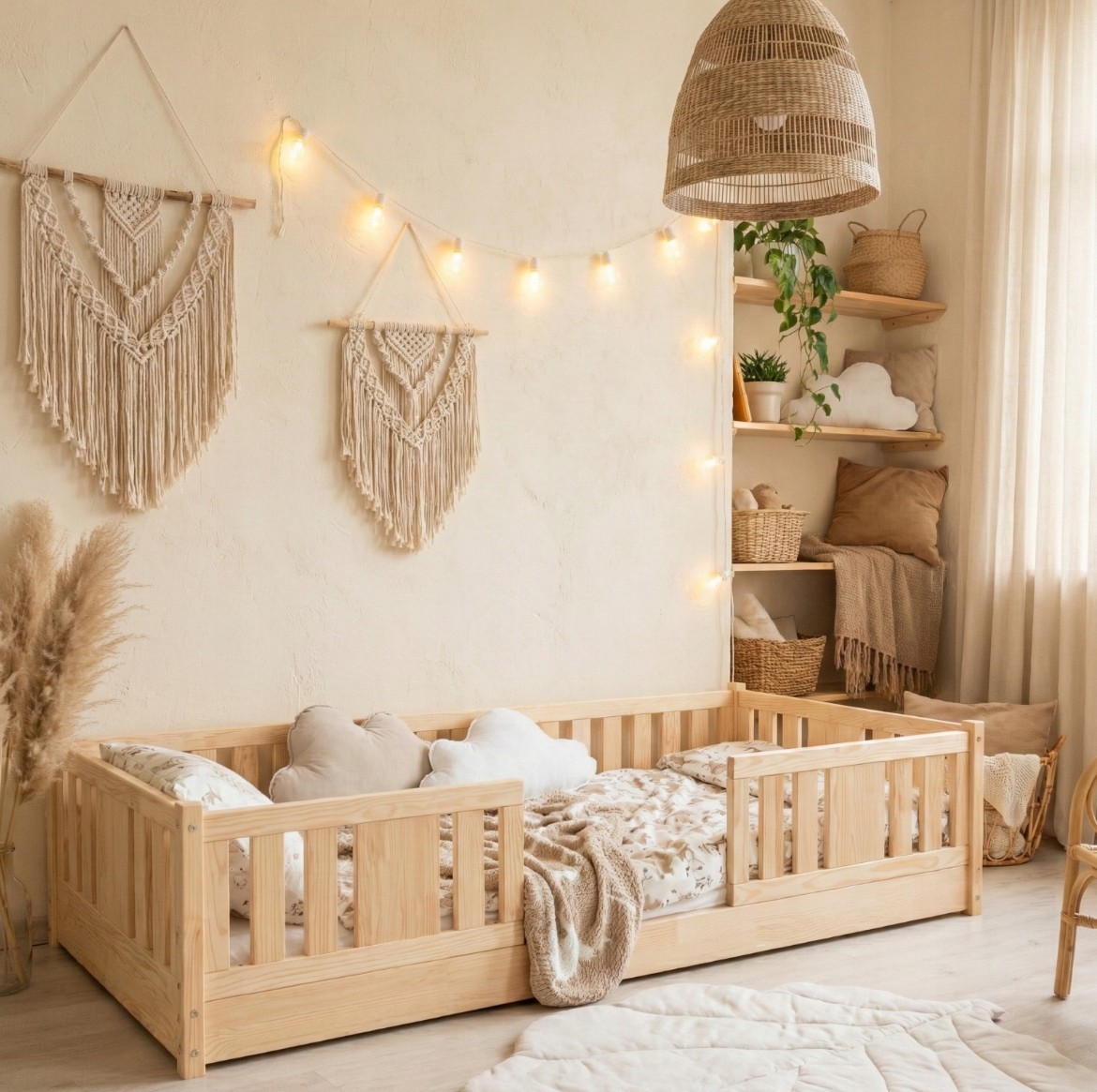 Montessori posteľ NIKO je unikátna nízka detská posteľ so zvislými lamelami, navrhnutá s ohľadom na najmladších užívateľov. Vďaka výnimočne nízkemu dizajnu – s nohou vysokou 0 cm – je matrac blízko podlahy. To umožňuje vášmu dieťaťu ľahko vstávať z postele bez pomoci dospelej osoby a učiť sa samostatnosti a sebestačnosti od prvých dní spánku vo vlastnej izbe. Princíp Montessori kladie dôraz na voľnosť dieťaťa, čo táto posteľ ponúka. Tento kus nábytku kombinuje škandinávsku jednoduchosť, prírodné materiály a bezpečnosť – tri vlastnosti, ktoré ocení každý rodič. Posteľ NIKO je vyrobená výhradne z prírodného borovicového dreva o sile 2,2 cm pochádzajúceho z certifikovaných zdrojov. Prírodné drevo nielenže vyzerá krásne, ale je tiež úplne bezpečné - bez toxínov a pachov. Povrch postele je natretý ekologickými farbami na vodnej báze, ktoré spĺňajú prísne európske bezpečnostné normy EN 71-3. To znamená, že si môžete byť istí, že posteľ je vhodná aj pre najmenšie deti a alergikov. Posteľ ponúkame aj vo verzii bez povrchových úprav - nelakované drevo. Vďaka tomu sa dá ľahko prispôsobiť - jej vzhľad môžete upraviť morením, lakovaním alebo maľovaním podľa vlastného uváženia. Každý prvok rámu bol precízne vyleštený a hrany sú jemne zaoblené, aby bolo zaistené maximálne pohodlie a bezpečnosť. Bezpečnostné zábrany pri vstupe do postele sú odnímateľné.