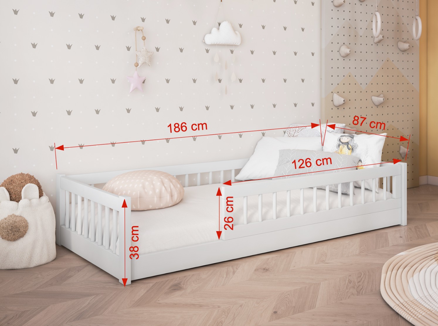 Detská posteľ z masívu borovice FLORES je elegantné jednolôžko, ktoré dokonale kombinuje funkčnosť s moderným designom. Vďaka nízkej konštrukcii a voľnému vstupu ju radíme medzi Montessori nábytok. Princíp Montessori kladie dôraz na voľnosť dieťaťa, čo táto posteľ ponúka. Dieťa má do postele voľný prístup a vďaka tomu, že je posteľ nízka a chránená bočnicami, je bezpečná aj pre najmenšie deti . Posteľ sa vyznačuje svojou praktickosťou a atraktívnym dizajnom , ktorý skvele zapadne do každej detskej izby. Posteľ je vyrobená z veľmi kvalitného borovicového dreva , ktoré je ošetrené tromi vrstvami ekologického laku. Tým je zaistená vysoká odolnosť postele voči mechanickému poškodeniu a rôznym druhom nečistôt. Bezpečnosť detí zaisťujú vysoké bočnice a ochranná bariéra , ktorá zabráni nechceným pádom dieťaťa počas spánku.