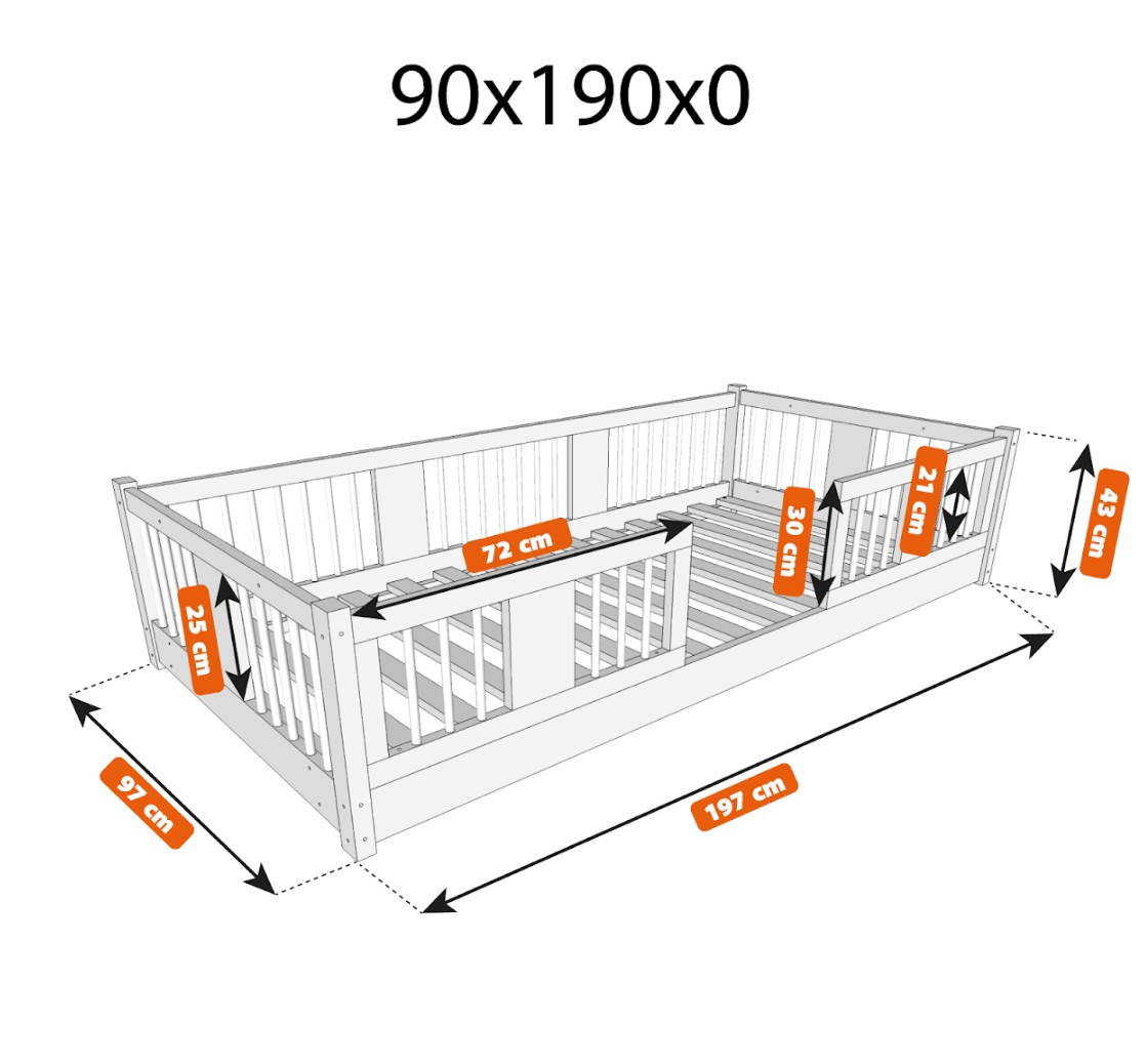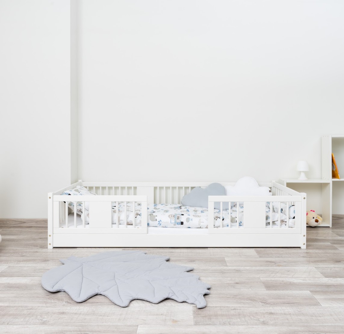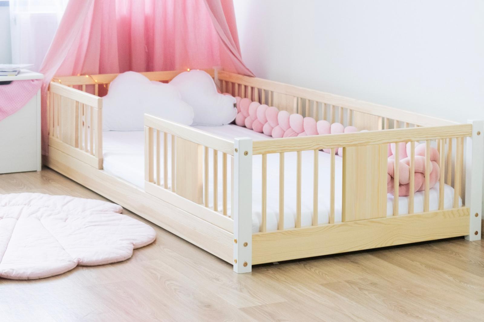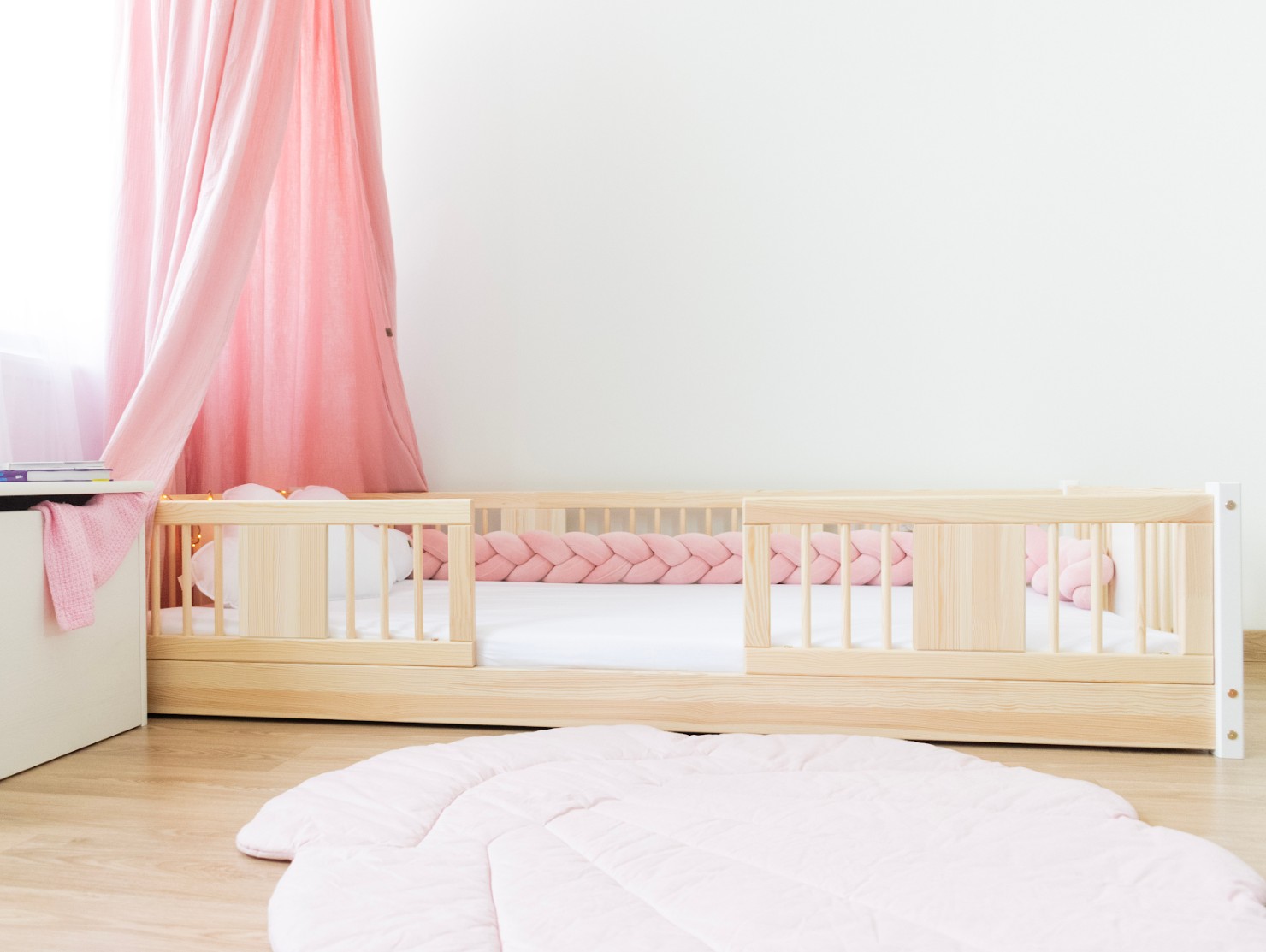 Montessori posteľ LUNA je unikátna nízka detská posteľ s guľatými latkami, navrhnutá s ohľadom na najmladších užívateľov. Vďaka výške 0 cm sa rám dotýka podlahy, čo deťom umožňuje samostatné vstávanie a lezenie z postele a bezpečne ich učia samostatnosti. Princíp Montessori kladie dôraz na voľnosť dieťaťa, čo táto posteľ ponúka. Je to perfektná voľba pre rodičov, ktorí hľadajú prvú posteľ pre svoje dieťa, kombinujúce estetiku, odolnosť a bezpečnosť v duchu štýlu Montessori. Posteľ LUNA je vyrobená výhradne z prírodného borovicového dreva pochádzajúceho z certifikovaných zdrojov. Prírodné drevo nielenže vyzerá krásne, ale je tiež úplne bezpečné - bez toxínov a pachov. Povrch postele je natretý ekologickými farbami na vodnej báze, ktoré spĺňajú prísne európske bezpečnostné normy EN 71-3. To znamená, že si môžete byť istí, že posteľ je vhodná aj pre najmenšie deti a alergikov. Posteľ ponúkame aj vo verzii bez povrchových úprav - nelakované drevo. Vďaka tomu sa dá ľahko prispôsobiť - jej vzhľad môžete upraviť morením, lakovaním alebo maľovaním podľa vlastného uváženia. Každý prvok rámu bol precízne vyleštený a hrany sú jemne zaoblené, aby bolo zaistené maximálne pohodlie a bezpečnosť. Bezpečnostné zábrany pri vstupe do postele sú odnímateľné.