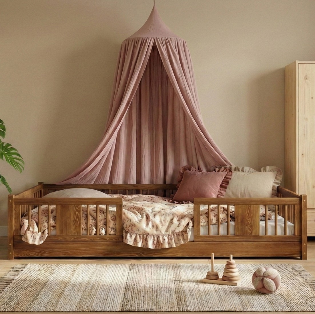 Montessori posteľ LUNA je unikátna nízka detská posteľ s guľatými latkami, navrhnutá s ohľadom na najmladších užívateľov. Vďaka výške 0 cm sa rám dotýka podlahy, čo deťom umožňuje samostatné vstávanie a lezenie z postele a bezpečne ich učí samostatnosti. Princíp Montessori kladie dôraz na voľnosť dieťaťa, čo táto posteľ ponúka. Je to perfektná voľba pre rodičov, ktorí hľadajú prvú posteľ pre svoje dieťa, kombinujúce estetiku, odolnosť a bezpečnosť v duchu štýlu Montessori. Posteľ LUNA je vyrobená výhradne z prírodného borovicového dreva o sile 2,2 cm pochádzajúceho z certifikovaných zdrojov. Prírodné drevo nielenže vyzerá krásne, ale je tiež úplne bezpečné - bez toxínov a pachov. Povrch postele je natretý ekologickými farbami na vodnej báze, ktoré spĺňajú prísne európske bezpečnostné normy EN 71-3. To znamená, že si môžete byť istí, že posteľ je vhodná aj pre najmenšie deti a alergikov. Posteľ ponúkame aj vo verzii bez povrchových úprav - nelakované drevo. Vďaka tomu sa dá ľahko prispôsobiť - jej vzhľad môžete upraviť morením, lakovaním alebo maľovaním podľa vlastného uváženia. Každý prvok rámu bol precízne vyleštený a hrany sú jemne zaoblené, aby bolo zaistené maximálne pohodlie a bezpečnosť. Bezpečnostné zábrany pri vstupe do postele sú odnímateľné.