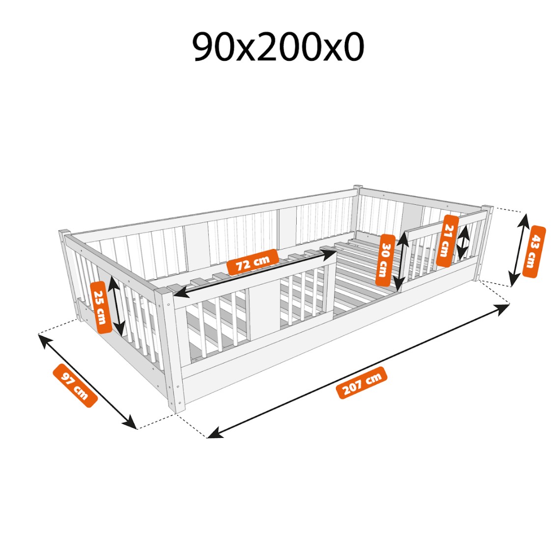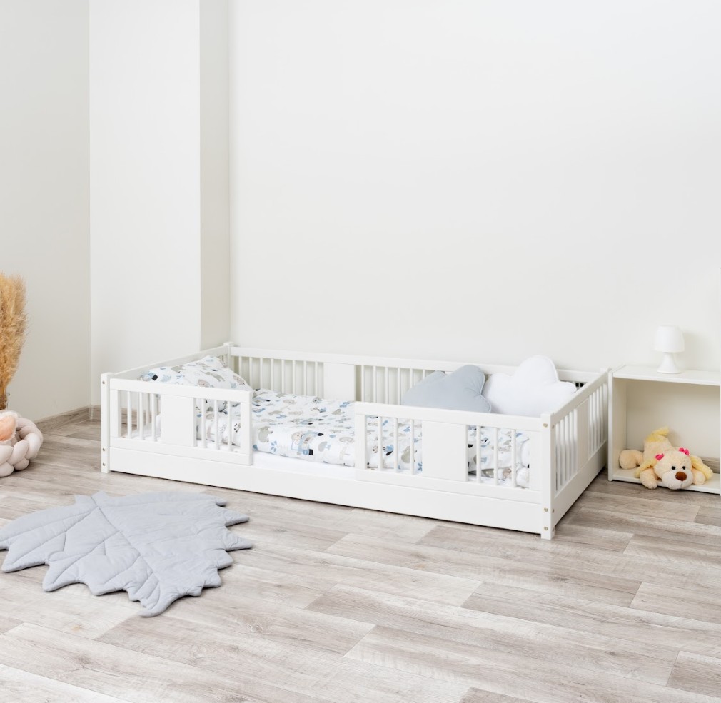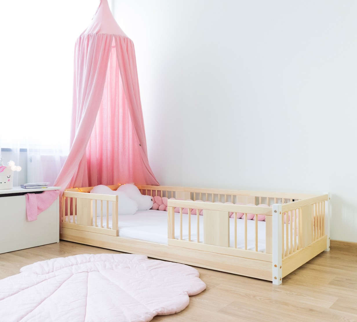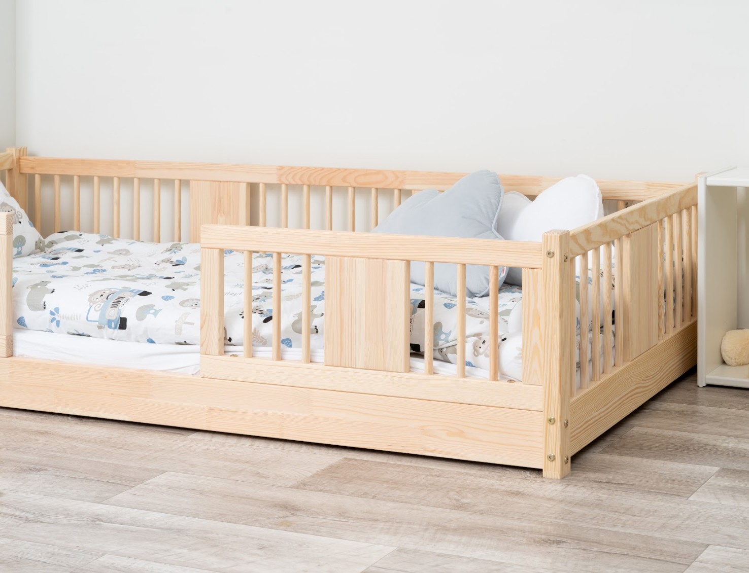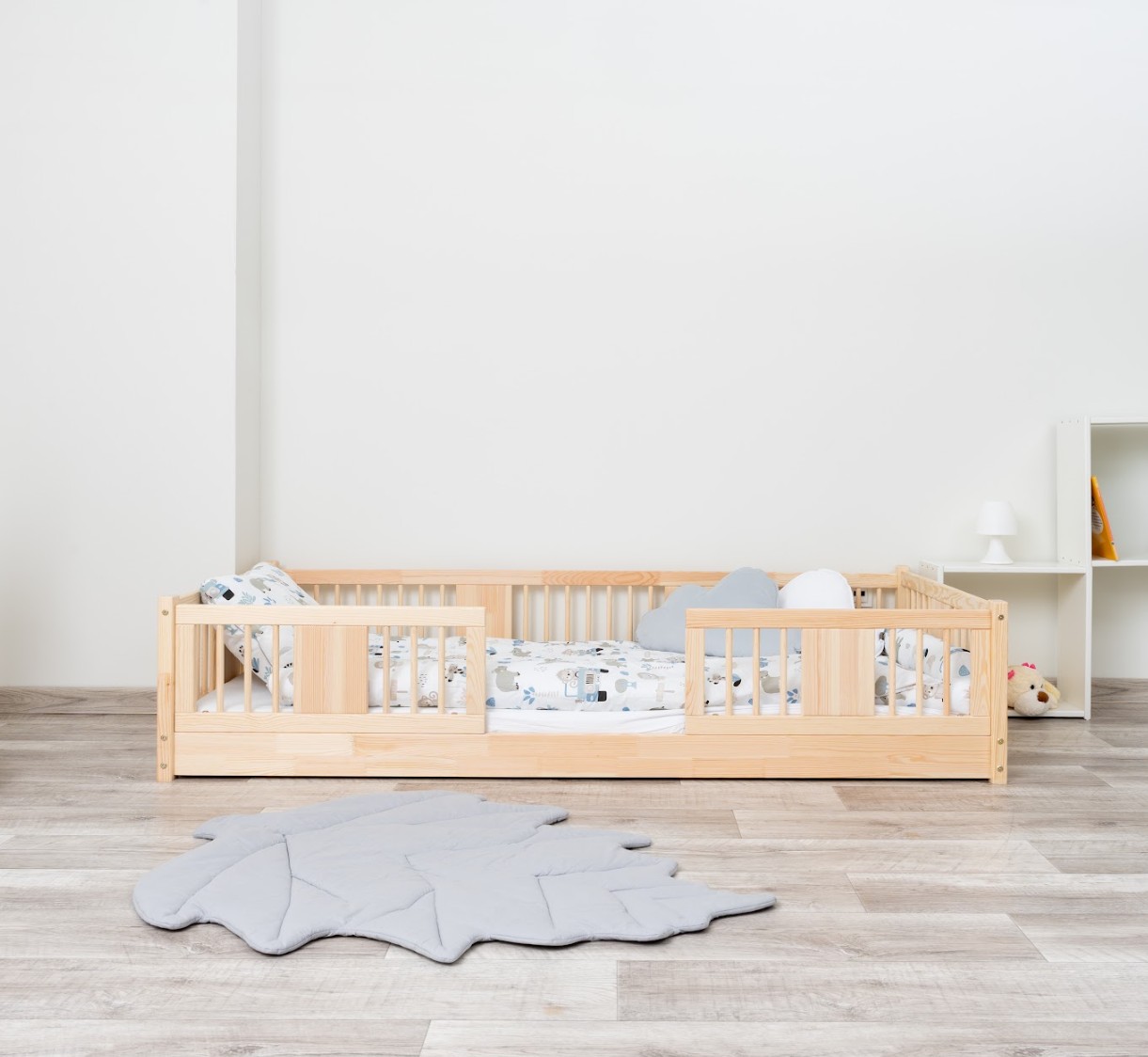 Montessori posteľ LUNA je unikátna nízka detská posteľ s guľatými latkami, navrhnutá s ohľadom na najmladších užívateľov. Vďaka výške 0 cm sa rám dotýka podlahy, čo deťom umožňuje samostatné vstávanie a lezenie z postele a bezpečne ich učia samostatnosti. Princíp Montessori kladie dôraz na voľnosť dieťaťa, čo táto posteľ ponúka. Je to perfektná voľba pre rodičov, ktorí hľadajú prvú posteľ pre svoje dieťa, kombinujúce estetiku, odolnosť a bezpečnosť v duchu štýlu Montessori. Posteľ LUNA je vyrobená výhradne z prírodného borovicového dreva pochádzajúceho z certifikovaných zdrojov. Prírodné drevo nielenže vyzerá krásne, ale je tiež úplne bezpečné - bez toxínov a pachov. Povrch postele je natretý ekologickými farbami na vodnej báze, ktoré spĺňajú prísne európske bezpečnostné normy EN 71-3. To znamená, že si môžete byť istí, že posteľ je vhodná aj pre najmenšie deti a alergikov. Posteľ ponúkame aj vo verzii bez povrchových úprav - nelakované drevo. Vďaka tomu sa dá ľahko prispôsobiť - jej vzhľad môžete upraviť morením, lakovaním alebo maľovaním podľa vlastného uváženia. Každý prvok rámu bol precízne vyleštený a hrany sú jemne zaoblené, aby bolo zaistené maximálne pohodlie a bezpečnosť. Bezpečnostné zábrany pri vstupe do postele sú odnímateľné.