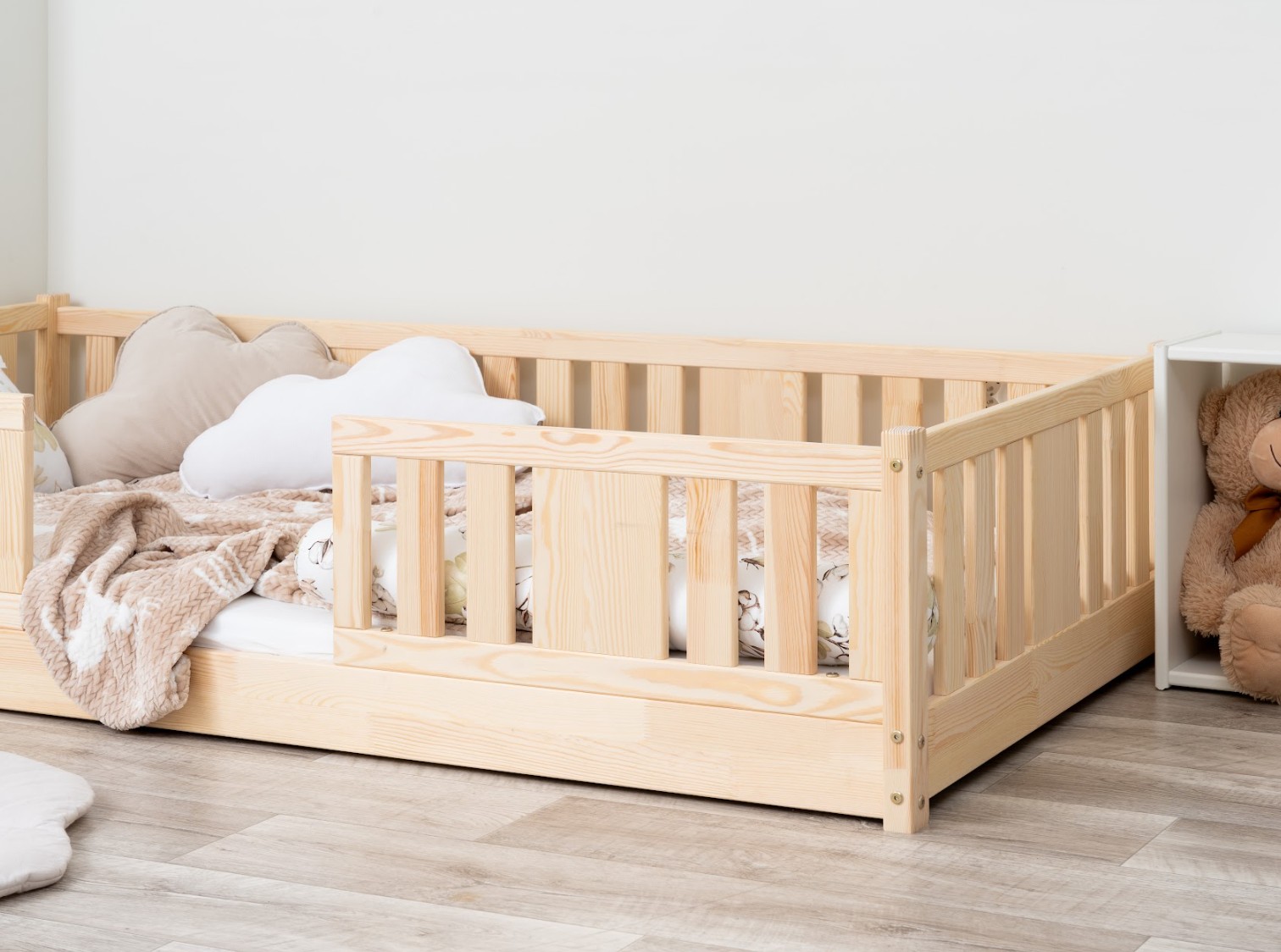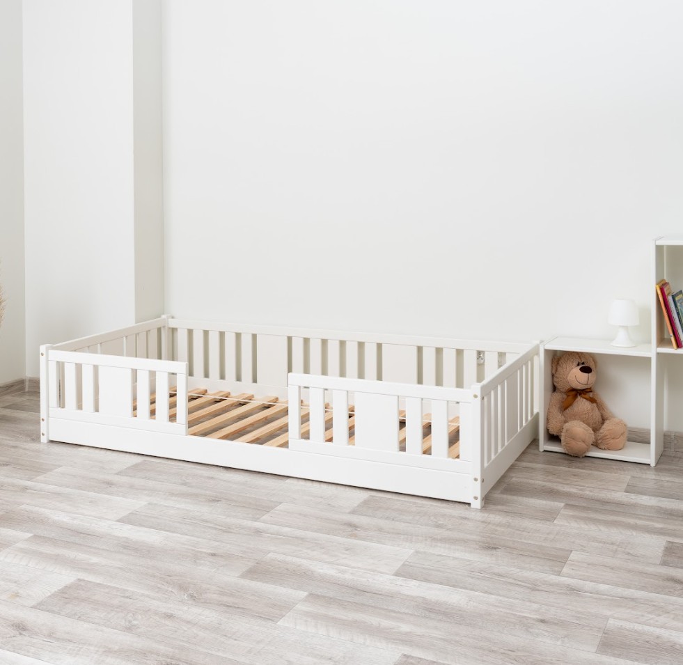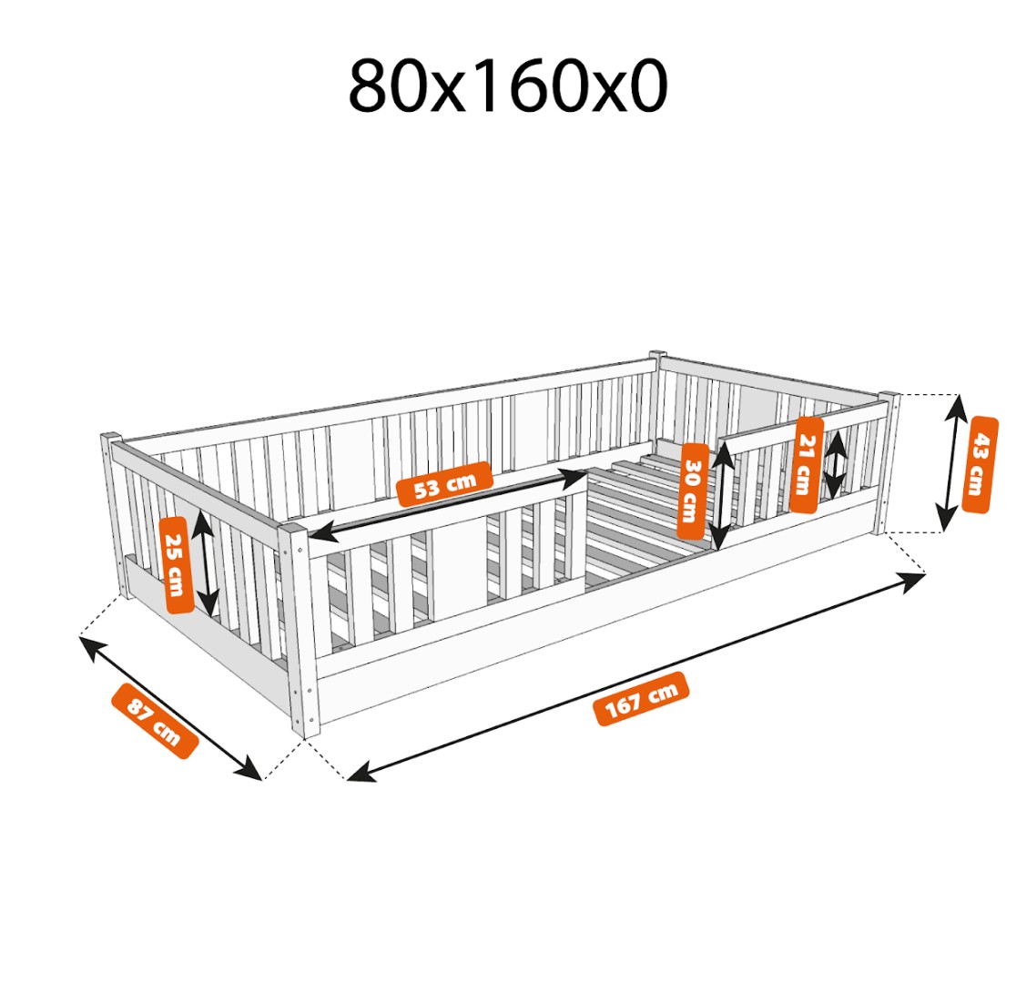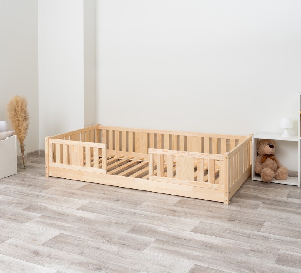 Montessori posteľ NIKO je unikátna nízka detská posteľ so zvislými lamelami, navrhnutá s ohľadom na najmladších užívateľov. Vďaka výnimočne nízkemu dizajnu – s nohou vysokou 0 cm – je matrac blízko podlahy. To umožňuje vášmu dieťaťu ľahko vstávať z postele bez pomoci dospelej osoby a učiť sa samostatnosti a sebestačnosti od prvých dní spánku vo vlastnej izbe. Princíp Montessori kladie dôraz na voľnosť dieťaťa, čo táto posteľ ponúka. Tento kus nábytku kombinuje škandinávsku jednoduchosť, prírodné materiály a bezpečnosť – tri vlastnosti, ktoré ocení každý rodič. Posteľ NIKO je vyrobená výhradne z prírodného borovicového dreva pochádzajúceho z certifikovaných zdrojov. Prírodné drevo nielenže vyzerá krásne, ale je tiež úplne bezpečné - bez toxínov a pachov. Povrch postele je natretý ekologickými farbami na vodnej báze, ktoré spĺňajú prísne európske bezpečnostné normy EN 71-3. To znamená, že si môžete byť istí, že posteľ je vhodná aj pre najmenšie deti a alergikov. Posteľ ponúkame aj vo verzii bez povrchových úprav - nelakované drevo. Vďaka tomu sa dá ľahko prispôsobiť - jej vzhľad môžete upraviť morením, lakovaním alebo maľovaním podľa vlastného uváženia. Každý prvok rámu bol precízne vyleštený a hrany sú jemne zaoblené, aby bolo zaistené maximálne pohodlie a bezpečnosť. Bezpečnostné zábrany pri vstupe do postele sú odnímateľné.