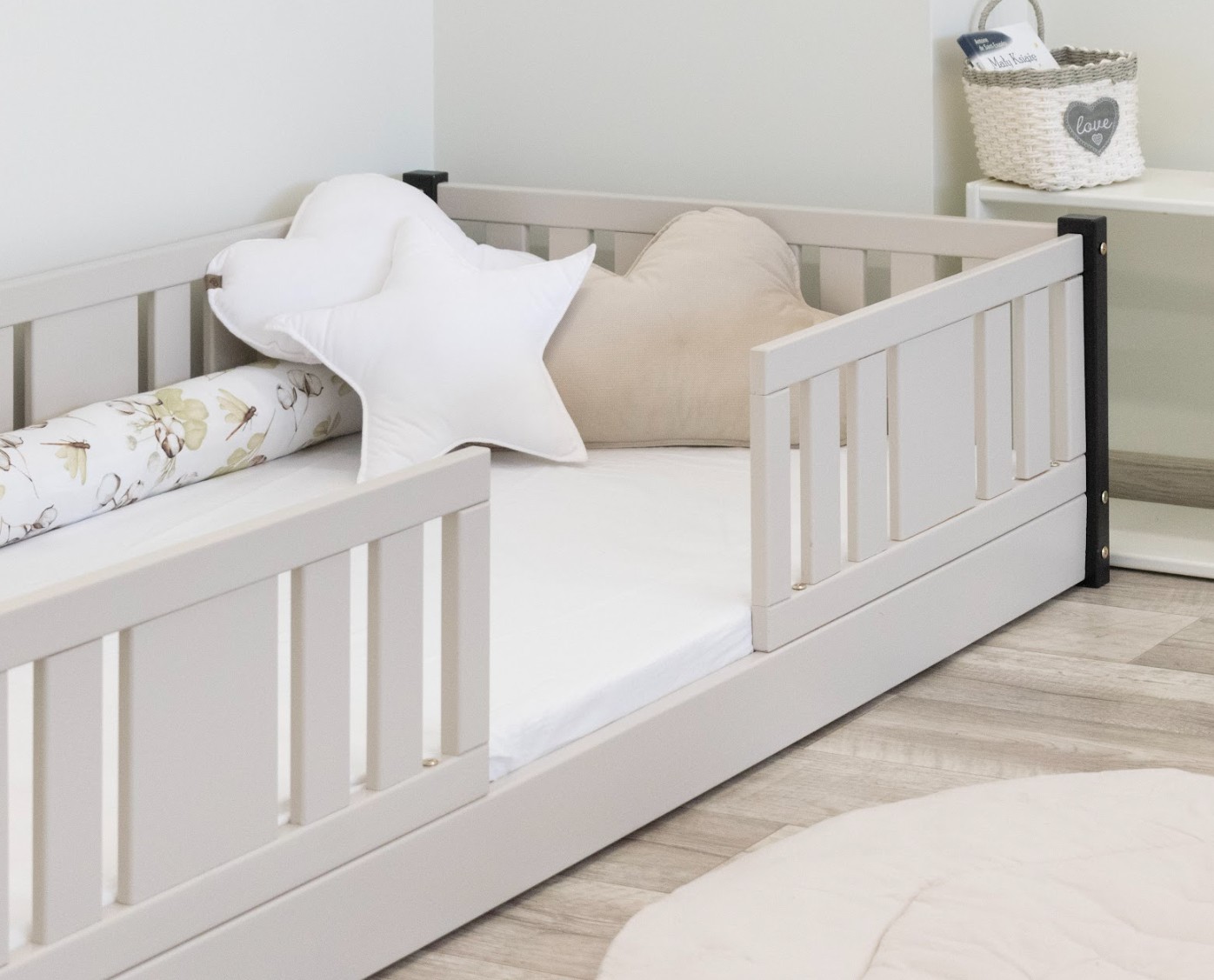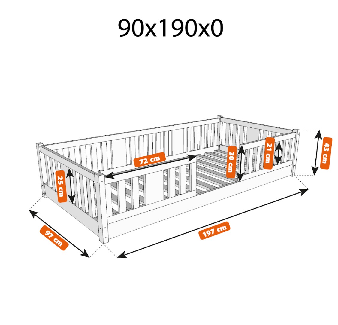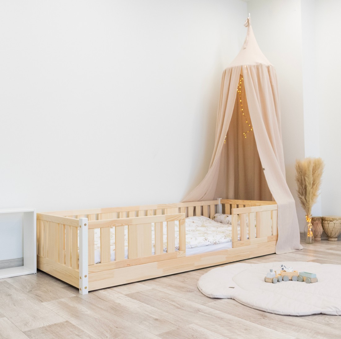 Montessori posteľ NIKO je unikátna nízka detská posteľ so zvislými lamelami, navrhnutá s ohľadom na najmladších užívateľov. Vďaka výnimočne nízkemu dizajnu – s nohou vysokou 0 cm – je matrac blízko podlahy. To umožňuje vášmu dieťaťu ľahko vstávať z postele bez pomoci dospelej osoby a učiť sa samostatnosti a sebestačnosti od prvých dní spánku vo vlastnej izbe. Princíp Montessori kladie dôraz na voľnosť dieťaťa, čo táto posteľ ponúka. Tento kus nábytku kombinuje škandinávsku jednoduchosť, prírodné materiály a bezpečnosť – tri vlastnosti, ktoré ocení každý rodič. Posteľ NIKO je vyrobená výhradne z prírodného borovicového dreva pochádzajúceho z certifikovaných zdrojov. Prírodné drevo nielenže vyzerá krásne, ale je tiež úplne bezpečné - bez toxínov a pachov. Povrch postele je natretý ekologickými farbami na vodnej báze, ktoré spĺňajú prísne európske bezpečnostné normy EN 71-3. To znamená, že si môžete byť istí, že posteľ je vhodná aj pre najmenšie deti a alergikov. Posteľ ponúkame aj vo verzii bez povrchových úprav - nelakované drevo. Vďaka tomu sa dá ľahko prispôsobiť - jej vzhľad môžete upraviť morením, lakovaním alebo maľovaním podľa vlastného uváženia. Každý prvok rámu bol precízne vyleštený a hrany sú jemne zaoblené, aby bolo zaistené maximálne pohodlie a bezpečnosť. Bezpečnostné zábrany pri vstupe do postele sú odnímateľné.