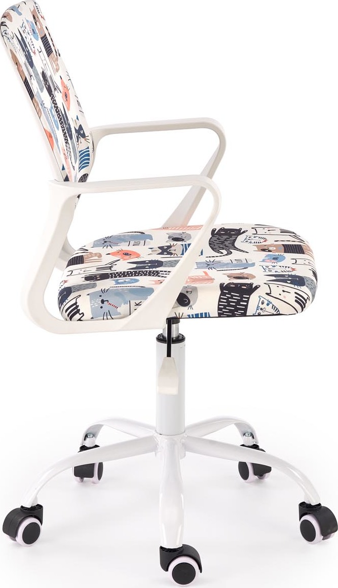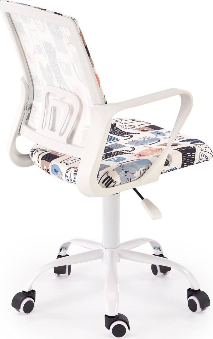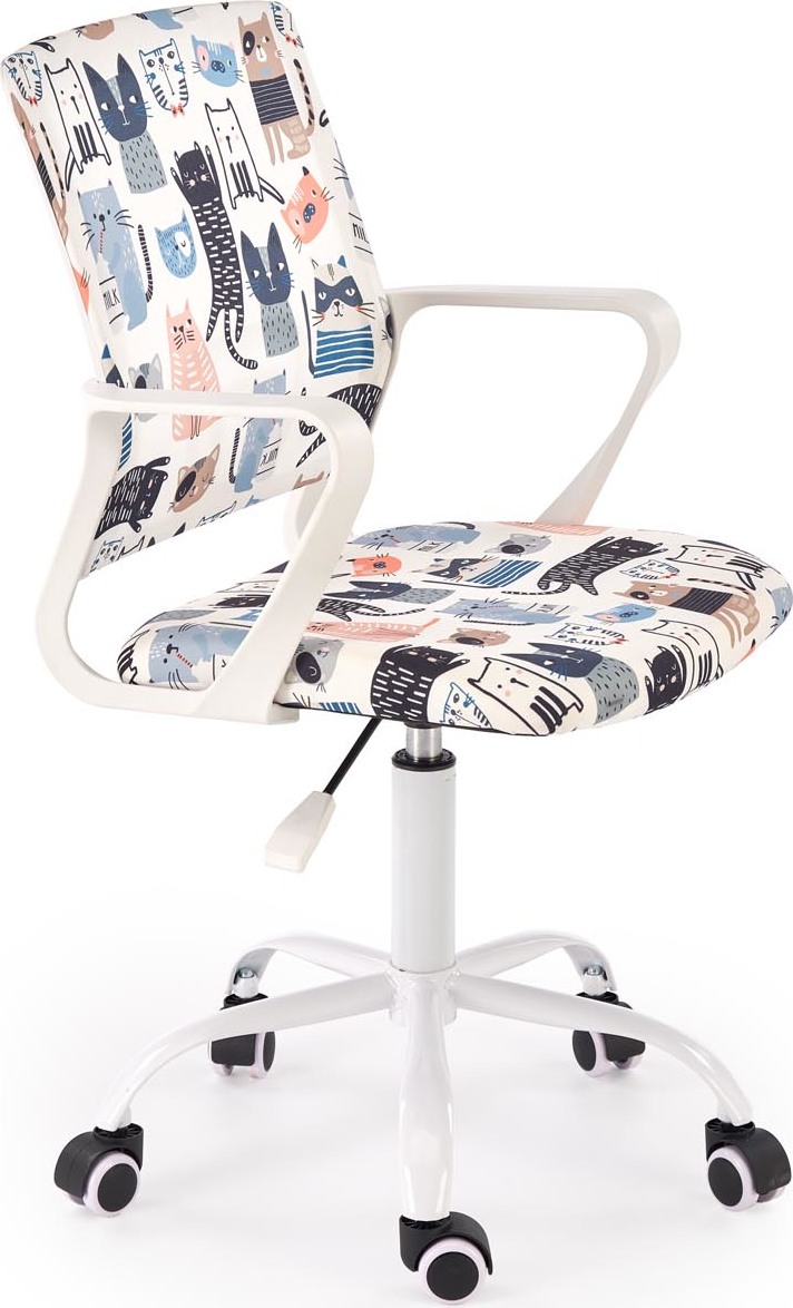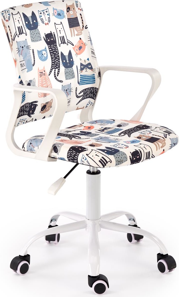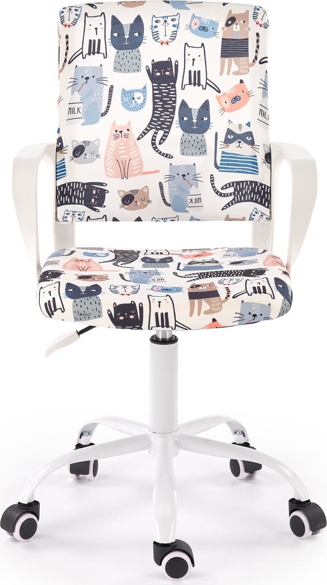 Otočná stolička Oris kombinuje pohodlie a funkčnosť s veselým dizajnom. Jej farebné čalúnenie s roztomilými mačkami dodáva jedinečný nádych, ktorý vnesie teplo a pozitívnu energiu do každej detskej izby, izby pre teenagerov alebo domácej kancelárie. Nastaviteľná výška sedadla umožňuje prispôsobiť stoličke výške užívateľa. Tvarované operadlo a lakťové opierky podporujú správne držanie tela pri štúdiu a práci, zatiaľ čo otočná základňa s kolieskami zaisťuje ľahký pohyb. Vysoko kvalitné čalúnenie odolné voči škvrnám si zachováva svoj estetický vzhľad po mnoho rokov. Pevná a stabilná konštrukcia zaručuje bezpečnosť a pohodlie – tento kus nábytku je vhodný na každodenné používanie deťmi i dospelými.