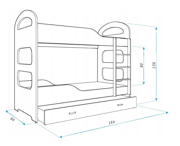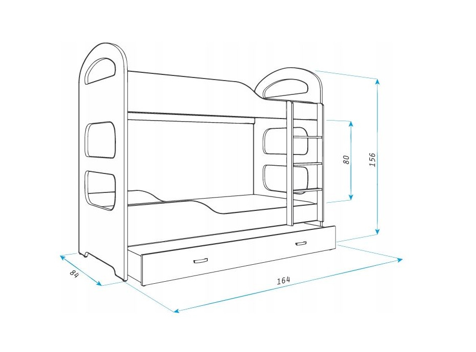 Detská poschodová posteľ Dominik s dvojlôžkom ušetrí priestor v detskej izbe!Táto posteľ so zásuvkou je vyrobená z pevných MDF dosiek, ktoré sú stabilné a veľmi praktické vďaka svojej ľahkej údržbe. Celá posteľ je ošetrená bezfarebným a bezzápachovým lakom, ktorý je ekologický a bezpečný pre deti. Konštrukcia postele je vyrobená tak, aby zabránila pádu dieťaťa, ochranné zábrany zaistia bezpečný a pokojný spánok. Súčasťou tejto postele sú tiež kvalitné drevené flex rošty a rebrík, ktorý pri prvej inštalácii môžete upevniť vpravo alebo vľavo. Veľkou výhodou postele je priestranný šuplík na kolieskach, do ktorého deti môžu uschovávať svoje veci.