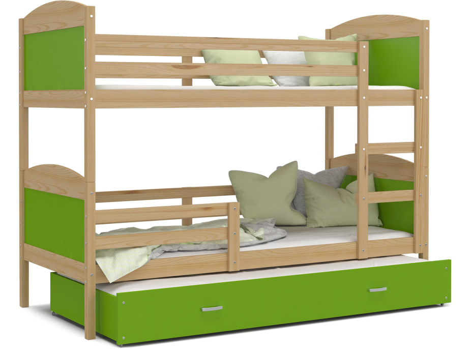 Detská poschodová posteľ s prístelkou MATTEO - 190x80 cm - zelená / borovica