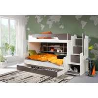 Stabilná poschodová posteľ poskytuje dostatok miesta na spánok a odpočinok vašich detí a zároveň ponúka množstvo úložného priestoru . Súčasťou postele sú schodíky , ktoré umožňujú prístup k hornému lôžku. Každý zo schodíkov je tiež úložným priestorom s výklopnými dvierkami , kam si vaše deti môžu ukladať svoje hračky a iné nevyhnutnosti. Schodíky sú univerzálne , možno ich umiestniť na pravú alebo ľavú stanu postele. Priestor medzi lôžkami je vybavený policou na odkladanie vecí, ktoré tak môžu mať deti hneď po ruke. Ďalší úložný priestor predstavuje výsuvný šuplík pod posteľou, ktorý môže slúžiť na ukladanie lôžkovín.