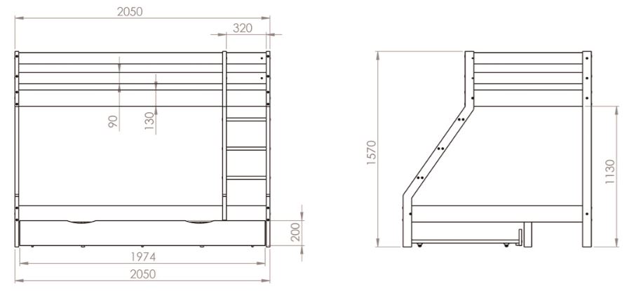 Detská poschodová posteľ z masívu 200x90 cm s rozšíreným spodným lôžkom 140 cm DENIS, so šuplíkom - šedá