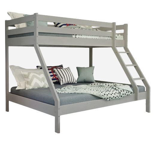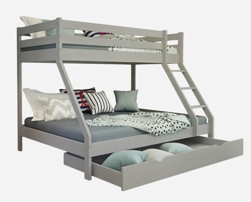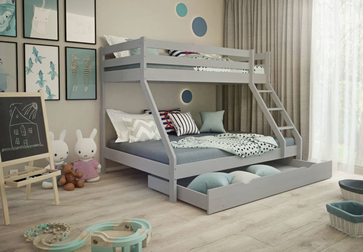 Pri výbere postele pre väčšie rodiny alebo do izieb s obmedzeným priestorom je vhodnou voľbou poschodová posteľ s rozšíreným spodným lôžkom. Táto posteľ umožňuje efektívne využitie priestoru a zároveň poskytuje pohodlný spánok pre až tri osoby bez toho, aby zaberala nadmerný priestor v miestnosti. Posteľ je vyrobená z prírodného borovicového dreva, ktoré kombinuje odolnosť s estetickým designom, ktorý vnáša do každej miestnosti teplo. Lôžko je ošetrené šedým lakom na vodnej báze, čo zvyšuje jej odolnosť proti poškriabaniu. Bezpečnosť najmenších členov rodiny je prioritou, preto vysoké zábradlie poschodovej postele poskytuje maximálnu ochranu počas spánku a hrania. Vďaka pevnej konštrukcii a kvalitným materiálom je zaručené, že posteľ poslúži po dlhú dobu. Súčasťou postele sú aj dva rošty z pevných borovicových lamiel. K posteli je možné zakúpiť aj priestranný šuplík na uloženie lôžkovín, hračiek a ďalších predmetov. Ďalším variantom je výsuvný šuplík s možnosťou prístelky , ktorý poskytuje trvalé alebo dočasné miesto pre spánok štvrtej osoby. Tým sa ešte zvýši efektivita využitia postele v detskej izbe.