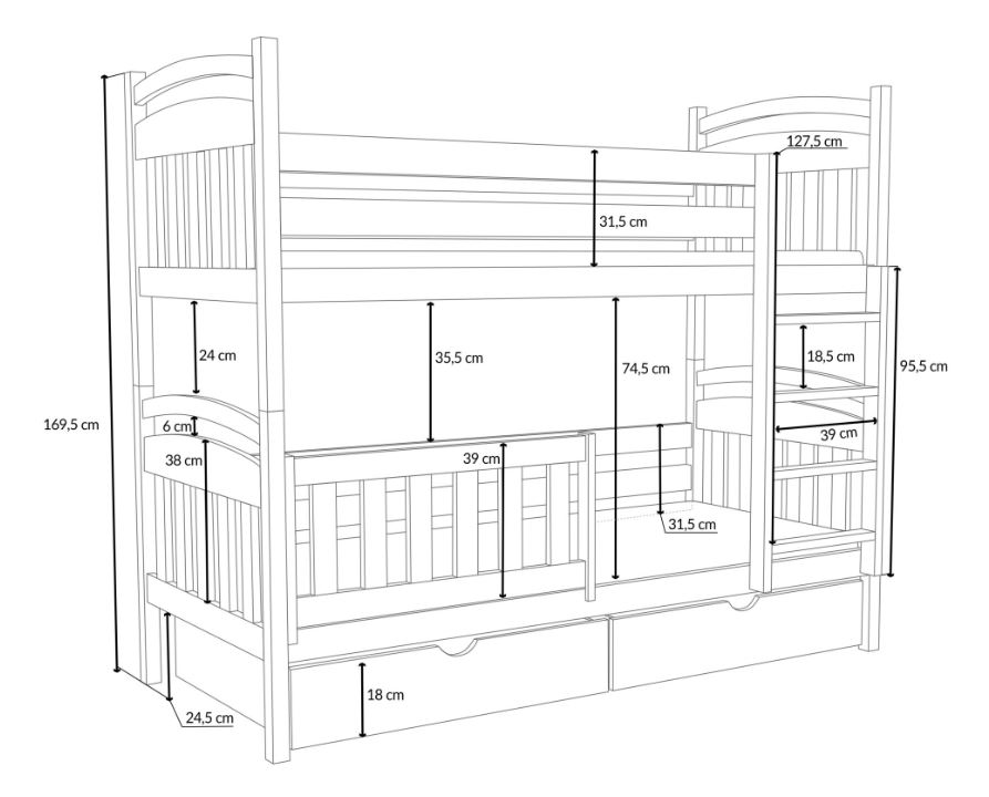 Poschodová posteľ Adam je perfektným riešením pre súrodencov zdieľajúcich detskú izbičku. Poschodová posteľ zaručuje úsporu miesta a zároveň zaisťuje pokojný spánok pre obe deti. Pevná konštrukcia z najkvalitnejšieho dreva zaisťuje bezpečnosť aj pri najintenzívnejšej hre. U bočníc a čiel je šírka použitého materiálu 2,6 cm. Adam je vysoká poschodová posteľ, ktorá zaisťuje bezpečnosť vďaka vysokým čelom a zábranám, ktoré chránia užívateľov pred pádmi. Rebrík vedúci na poschodie je stabilný a široký, čo umožňuje jeho bezpečné používanie aj malým deťom. Posteľ je vyrobená z borovicového dreva a je pokrytá ekologickým lakom na vodnej báze, vďaka čomu je úplne prírodná a zdravotne nezávadná pre všetkých členov domácnosti. Posteľ je dodávaná vrátane dvoch praktických šuplíkov , ktoré poskytujú dostatok priestoru na uloženie lôžkovín. Súčasťou postele sú aj kvalitné rošty . Spodné lôžko je doplnené o ochrannú bariérku s možnosťou univerzálnej montáže na pravú aj ľavú stranu. Bariérku je možné tiež úplne odstrániť, akonáhle ju dieťa už nepotrebuje.