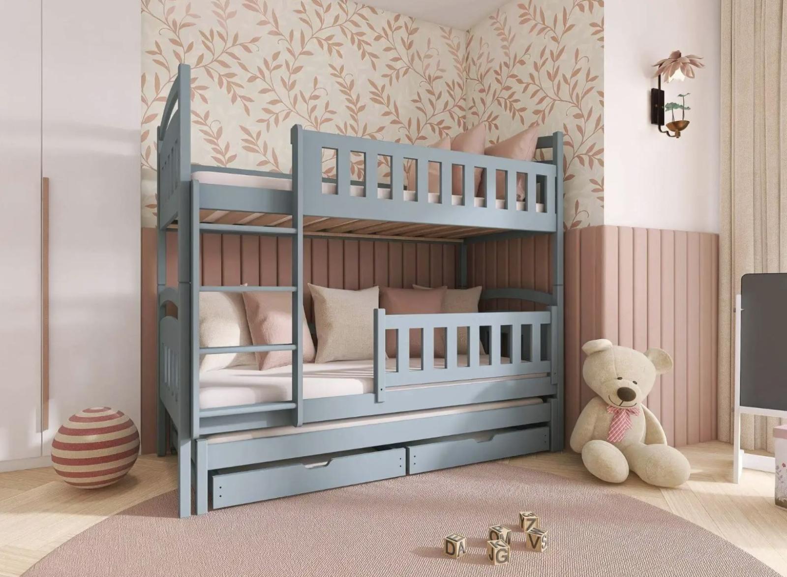 Detská poschodová posteľ z masívu borovice BOHDANA s prístelkou a šuplíkmi - 200x90 cm - ŠEDÁ
