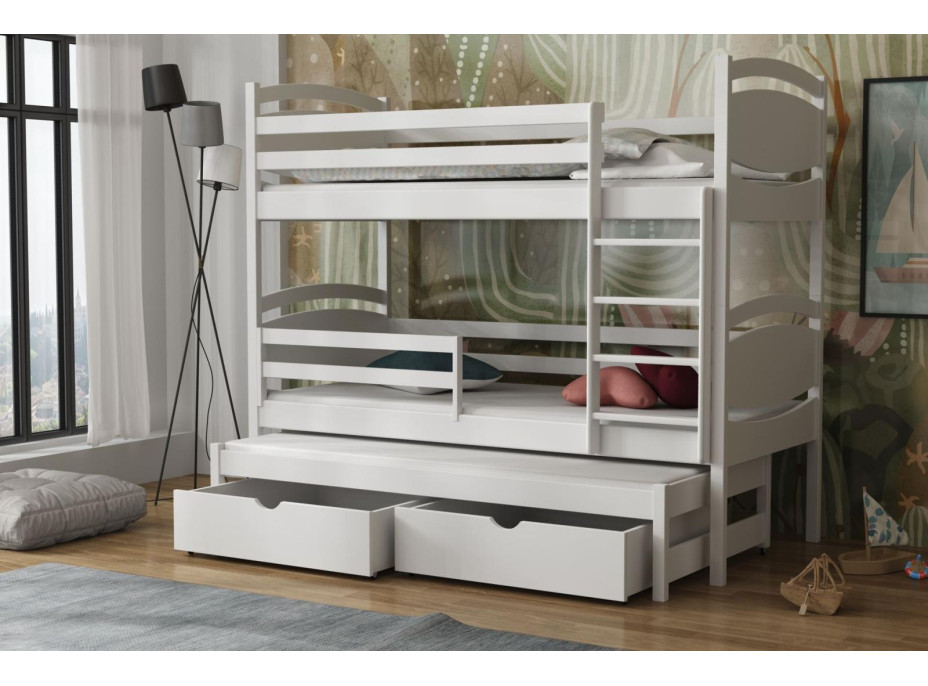 Detská poschodová posteľ z masívu borovice EMA s prístelkou a šuplíky - 200x90 cm - BIELA