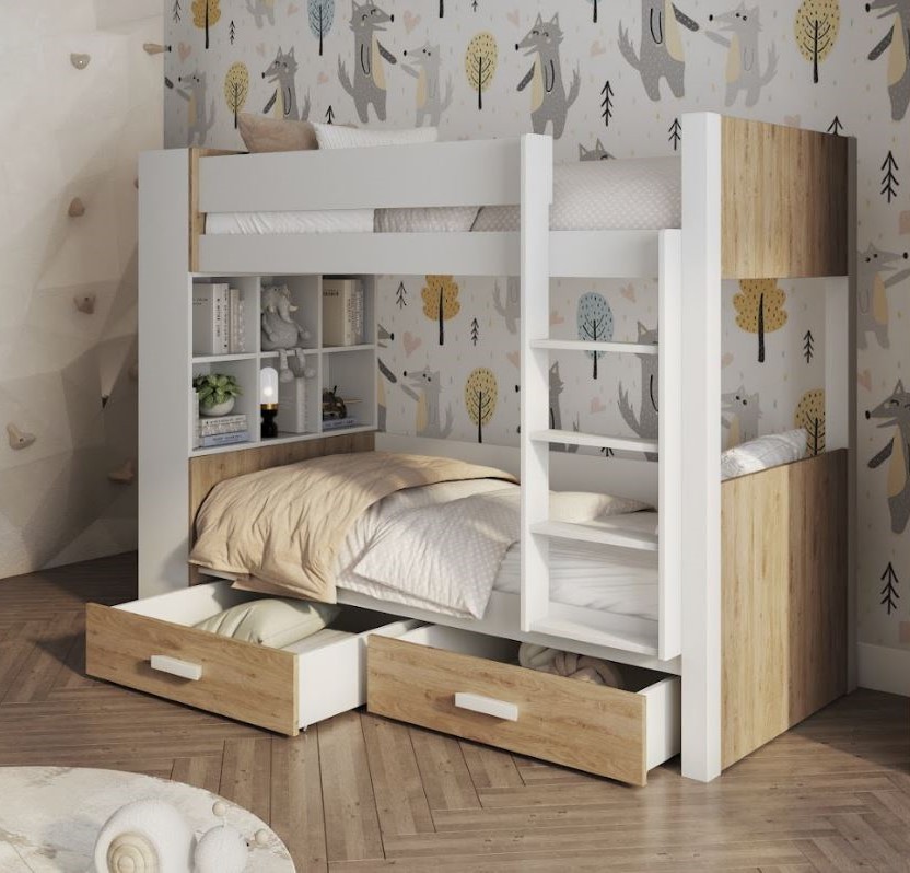 Detská poschodová posteľ z masívu borovice GASPAR so šuplíkmi a regálom - 180x80 cm - biela/dub shetland