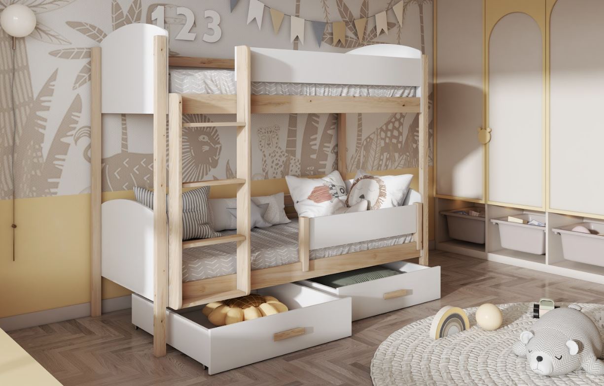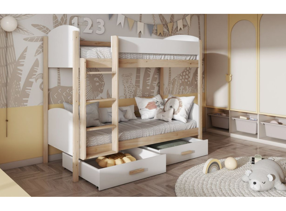Detská poschodová posteľ z masívu borovice JORDAN so šuplíkmi - 200x90 cm - prírodná borovica/biela