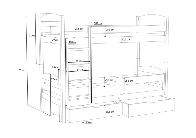 Poschodová posteľ KAJETÁN zaujme minimalistickým dizajnom, vďaka ktorému skvele zapadne do každej detskej izby. Ide o útulné, elegantné a pohodlné riešenie pre dve deti, ktoré skvele šetria miesto. Táto posteľ určite urobí radosť vašim deťom a poskytne im dokonalé miesto na oddych a hru. Kajetán je pohodlná drevená poschodová posteľ, ktorá má aj napriek svojej jednoduchej konštrukcii mnoho funkčných riešení. Vysoké, zaoblené čelá s malými medzerami dodávajú nielen estetickú hodnotu, ale tiež zaisťujú pohodlný spánok detí. Zábradlie umiestnené pri vrchnom lôžku chránia deti pred pádom a široký rebrík umožňuje ľahký prístup do horného lôžka. Posteľ Kajetán je navyše vybavená dvoma šuplíkmi , umožňujúcimi pohodlné uloženie hračiek, lôžkovín alebo iných potrebných vecí. Posteľ je vyrobená z borovicového dreva a pokrytá vrstvami ekologického laku na vodnej báze, ktorý je úplne zdravotne neutrálny a nezávadný. U bočníc a čiel je šírka použitého materiálu 2,6 cm. Súčasťou postele sú aj kvalitné rošty . Spodné lôžko je doplnené o ochrannú bariérku s možnosťou univerzálnej montáže na pravú aj ľavú stranu. Bariérku je možné tiež úplne odstrániť, akonáhle ju dieťa už nepotrebuje.