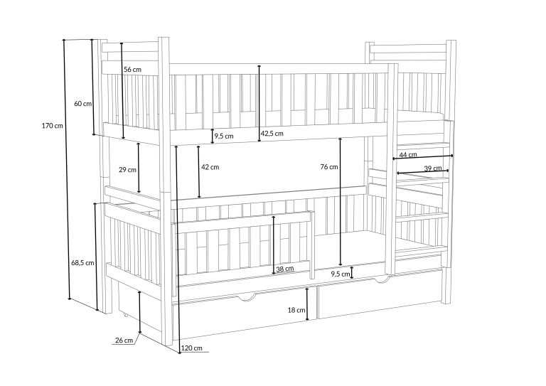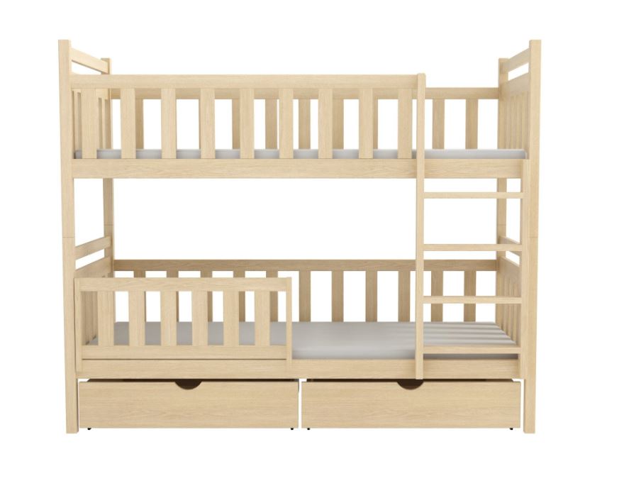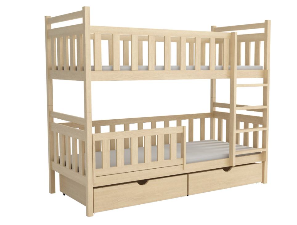 Poschodová posteľ Karol je perfektným riešením pre súrodencov zdieľajúcich detskú izbičku. Model Karel zaručuje úsporu miesta a zároveň zaisťuje pokojný spánok pre obe deti. Pevná konštrukcia z najkvalitnejšieho dreva zaisťuje bezpečnosť aj pri najintenzívnejšej hre. U bočníc a čiel je šírka použitého materiálu 2,6 cm . Karel je vysoká poschodová posteľ, ktorá zaisťuje bezpečnosť vďaka vysokým čelom a zábranám, ktoré chránia užívateľov pred pádmi. Rebrík vedúci na poschodie je stabilný a široký, čo umožňuje jeho bezpečné používanie aj malým deťom. Posteľ je vyrobená z borovicového dreva a je pokrytá ekologickým lakom na vodnej báze, vďaka čomu je úplne prírodná a zdravotne nezávadná pre všetkých členov domácnosti. Posteľ je dodávaná vrátane dvoch praktických šuplíkov , ktoré poskytujú dostatok priestoru na uloženie lôžkovín. Súčasťou postele sú aj kvalitné rošty . Spodné lôžko je doplnené o ochrannú bariérku s možnosťou univerzálnej montáže na pravú aj ľavú stranu. Bariérku je možné tiež úplne odstrániť, akonáhle ju dieťa už nepotrebuje.