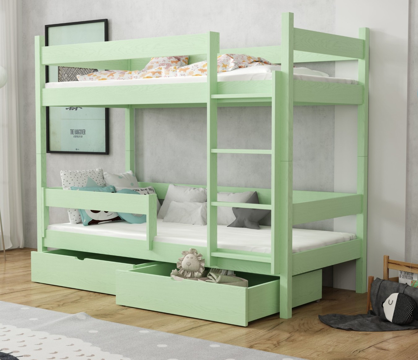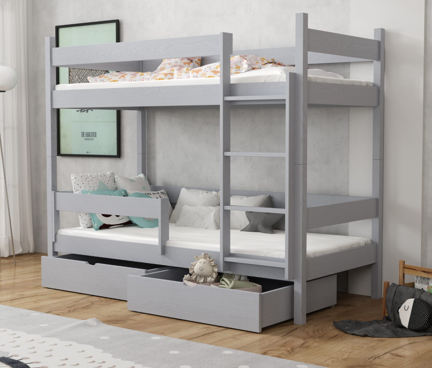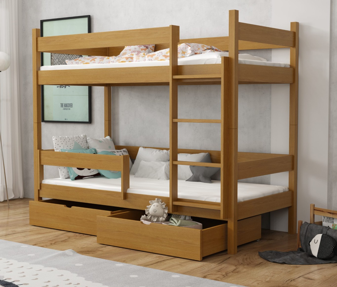 Poschodová posteľ LEGEND je detská posteľ, ktorá osloví všetkých, ktorí oceňujú vkusný a minimalistický vzhľad. Jedná sa o perfektné riešenie pre súrodencov, ktorí zdieľajú izbu. Deťom zaručí pohodlný odpočinok a zaberie pomerne malú plochu. Dve priestranné miesta na spanie a veľká vzdialenosť medzi rámami dávajú používateľom pocit vlastného priestoru. Poschodová posteľ LEGEND je vybavená širokým rebríkom a ochrannou zábranou na hornom lôžku, ktorá účinne chráni pred nebezpečenstvom pádu. Poschodová posteľ je vyrobená z masívneho borovicového dreva , ktoré je veľmi pevné a kvalitné. U bočníc a čiel je šírka použitého materiálu 2,6 cm . Posteľ ponúkame v niekoľkých farebných variantoch, prípadne bez povrchových úprav. Surové drevo ponúka prirodzený vzhľad. Posteľ je ekologická, odolná a dá sa ľahko prispôsobiť - jej vzhľad môžete upraviť morením, lakovaním alebo maľovaním podľa vlastného uváženia. Farebné varianty sú ošetrené ekologickým lakom bez zápachu, ktorý zvyšuje odolnosť postele proti poškriabaniu. Posteľ je dodávaná vrátane dvoch praktických šuplíkov , ktoré poskytujú dostatok priestoru na uloženie lôžkovín. Súčasťou postele sú aj kvalitné rošty . Spodné lôžko je doplnené o ochrannú bariérku s možnosťou univerzálnej montáže na pravú aj ľavú stranu. Bariérku je možné tiež úplne odstrániť, akonáhle ju dieťa už nepotrebuje.