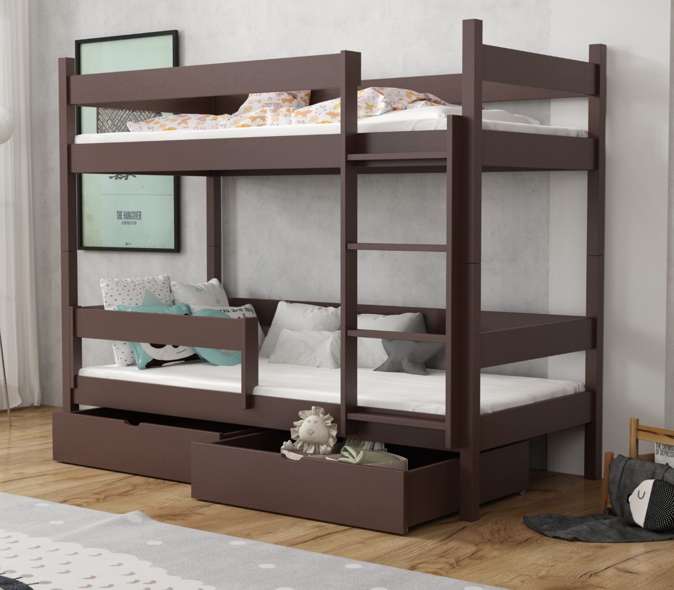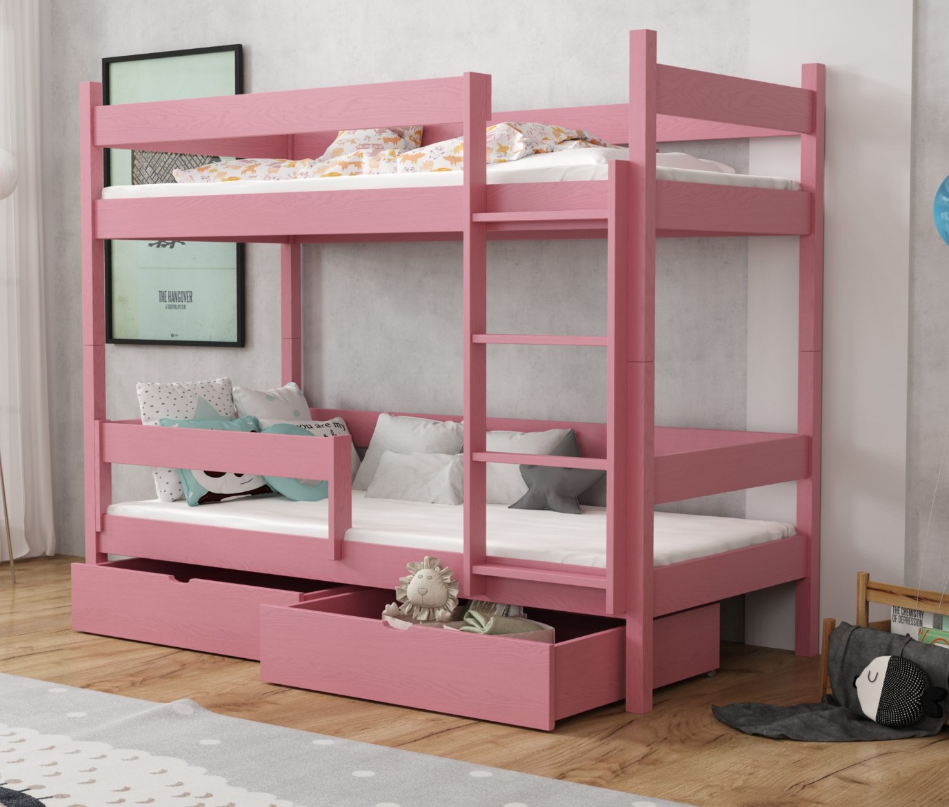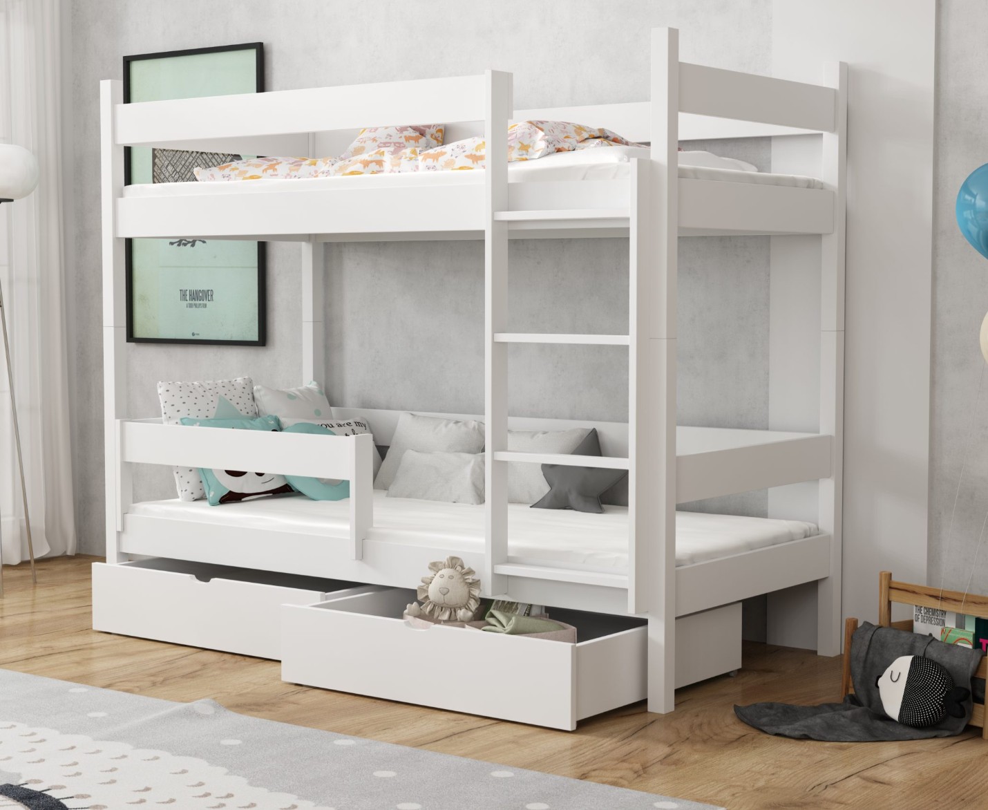 Poschodová posteľ LEGEND je detská posteľ, ktorá osloví všetkých, ktorí oceňujú vkusný a minimalistický vzhľad. Jedná sa o perfektné riešenie pre súrodencov, ktorí zdieľajú izbu. Deťom zaručí pohodlný odpočinok a zaberie pomerne malú plochu. Dve priestranné miesta na spanie a veľká vzdialenosť medzi rámami dávajú používateľom pocit vlastného priestoru. Poschodová posteľ LEGEND je vybavená širokým rebríkom a ochrannou zábranou na hornom lôžku, ktorá účinne chráni pred nebezpečenstvom pádu. Poschodová posteľ je vyrobená z masívneho borovicového dreva , ktoré je veľmi pevné a kvalitné. U bočníc a čiel je šírka použitého materiálu 2,6 cm . Posteľ ponúkame v niekoľkých farebných variantoch, prípadne bez povrchových úprav. Surové drevo ponúka prirodzený vzhľad. Posteľ je ekologická, odolná a dá sa ľahko prispôsobiť - jej vzhľad môžete upraviť morením, lakovaním alebo maľovaním podľa vlastného uváženia. Farebné varianty sú ošetrené ekologickým lakom bez zápachu, ktorý zvyšuje odolnosť postele proti poškriabaniu. Posteľ je dodávaná vrátane dvoch praktických šuplíkov , ktoré poskytujú dostatok priestoru na uloženie lôžkovín. Súčasťou postele sú aj kvalitné rošty . Spodné lôžko je doplnené o ochrannú bariérku s možnosťou univerzálnej montáže na pravú aj ľavú stranu. Bariérku je možné tiež úplne odstrániť, akonáhle ju dieťa už nepotrebuje.