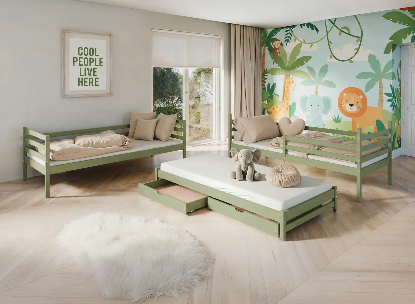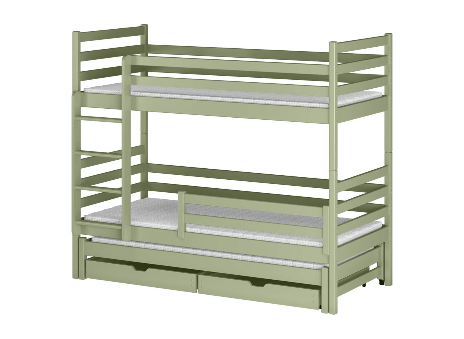 Detská poschodová posteľ z masívu borovice LUKÁŠ s prístelkou a šuplíkmi - 200x90 cm - OLIVOVO ZELENÁ