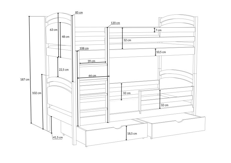 Poschodová posteľ Marcela je perfektným riešením pre súrodencov zdieľajúcich detskú izbičku. Poschodová posteľ zaručuje úsporu miesta a zároveň zaisťuje pokojný spánok pre obe deti. Pevná konštrukcia z najkvalitnejšieho dreva zaisťuje bezpečnosť aj pri najintenzívnejšej hre. U bočníc a čiel je šírka použitého materiálu 2,6 cm . Marcela je vysoká poschodová posteľ, ktorá zaisťuje bezpečnosť vďaka vysokým čelom a zábranám, ktoré chránia užívateľov pred pádmi. Rebrík vedúci na poschodie je stabilný a široký, čo umožňuje jeho bezpečné používanie aj malým deťom. Posteľ je vyrobená z borovicového dreva a je pokrytá ekologickým lakom na vodnej báze, vďaka čomu je úplne prírodná a zdravotne nezávadná pre všetkých členov domácnosti. Posteľ je dodávaná vrátane dvoch praktických šuplíkov , ktoré poskytujú dostatok priestoru na uloženie lôžkovín. Súčasťou postele sú aj kvalitné rošty . Spodné lôžko je doplnené o ochrannú bariérku s možnosťou univerzálnej montáže na pravú aj ľavú stranu. Bariérku je možné tiež úplne odstrániť, akonáhle ju dieťa už nepotrebuje.