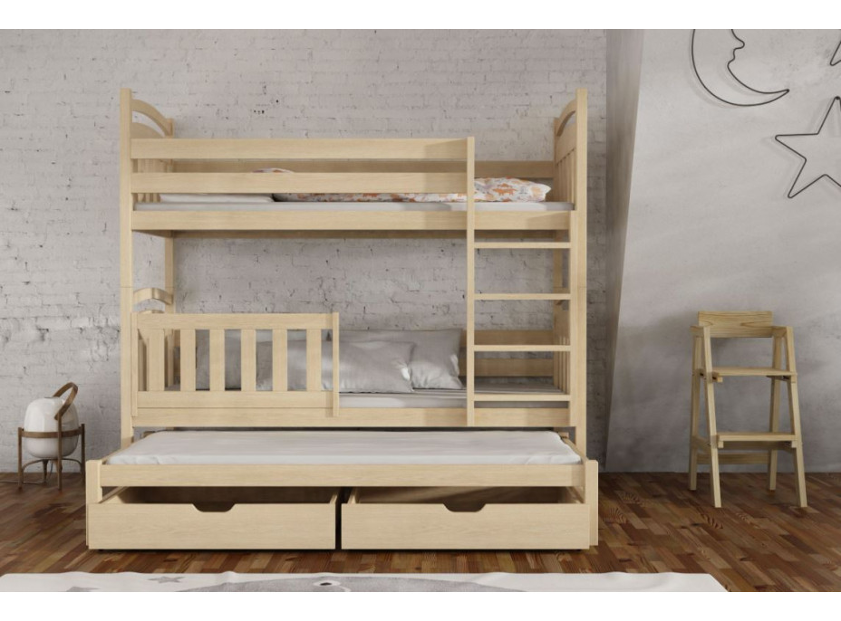 Detská poschodová posteľ z masívu borovice ONDRA s prístelkou a šuplíkmi - 200x90 cm - PRÍRODNÁ BOROVICA