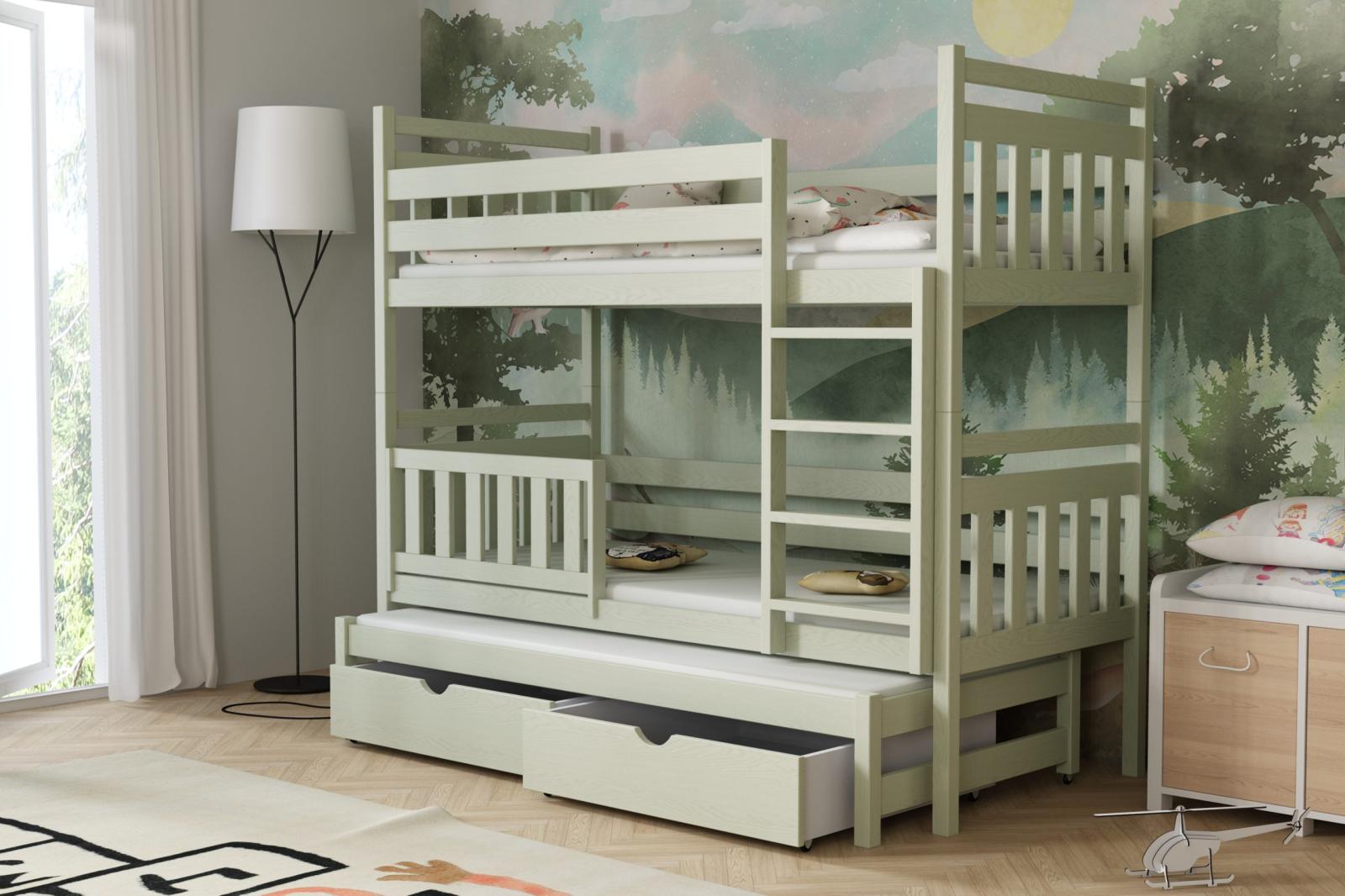 Detská poschodová posteľ z masívu borovice PETR s prístelkou a šuplíky - 200x90 cm - OLIVOVO ZELENÁ