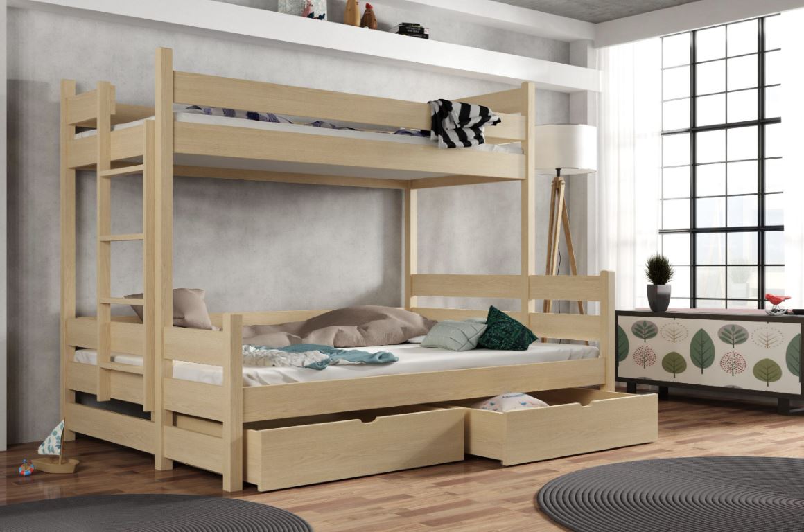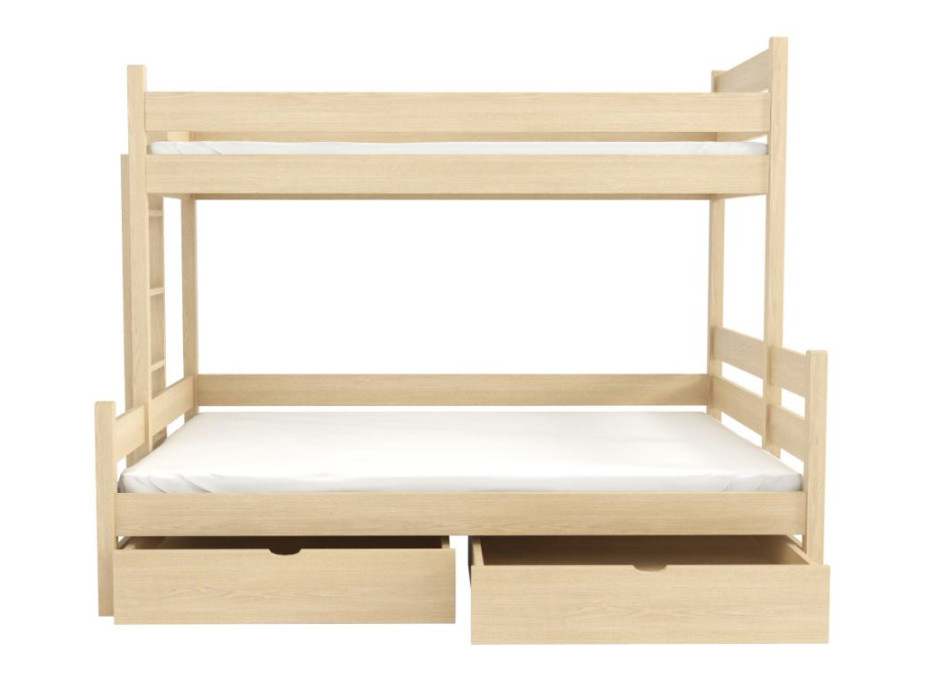Detská poschodová posteľ z masívu borovice s rozšíreným spodným lôžkom BERTA so šuplíkmi - 200x90/140 cm - PRÍRODNÁ BOROVICA