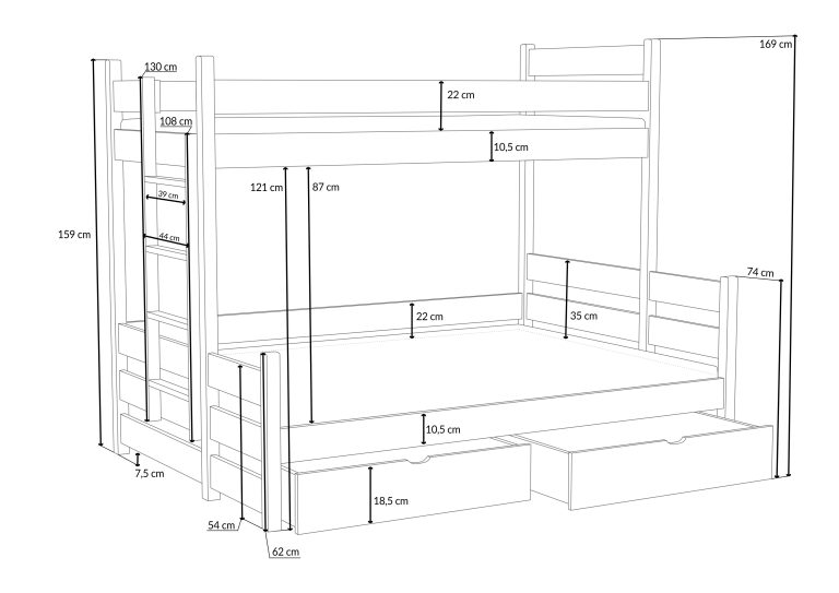 Posteľ Berta vďaka svojej konštrukcii zaistí pohodlný spánok aj trom osobám. Skvele sa preto bude hodiť do malého bytu, kde bývajú traja súrodenci alebo sa často bavia hostia. Vďaka svojej ľahkej konštrukcii a minimalistickému dizajnu nezahltí dizajn interiéru, ale skvele ho dopĺňa. Posteľ je vyrobená z tých najkvalitnejších materiálov ako je masívne borovicové drevo a ekologický lak na vodnej báze. Borovicové drevo sa vyznačuje vysokou odolnosťou a pružnosťou. U bočníc a čiel je šírka použitého materiálu 2,6 cm. Lak na vodnej báze je úplne hypoalergénny a bezpečný pre všetkých užívateľov. Rebrík a zábradlie horného poschodia sú trvalo pripevnené ku konštrukcii, čo zaisťuje maximálnu bezpečnosť užívateľov. Spodné poschodie je dostatočne široké a môže poskytnúť miesto na spanie až dvom osobám a cez deň môže byť miestom pre spoločné hranie alebo rozprávanie. Toto využitie priestoru je dobré najmä v malých miestnostiach. Posteľ je dodávaná s dvoma šuplíkmi , ktoré slúžia na uloženie lôžkovín alebo hračiek. Posteľ je dodávaná vrátane kvalitných roštov .