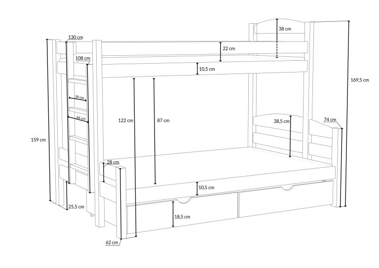 Posteľ Savana vďaka svojej konštrukcii zaistí pohodlný spánok aj trom osobám. Skvele sa preto bude hodiť do malého bytu, kde bývajú traja súrodenci alebo sa často bavia hostia. Vďaka svojej ľahkej konštrukcii a minimalistickému dizajnu nezahltí dizajn interiéru, ale skvele ho dopĺňa. Posteľ je vyrobená z tých najkvalitnejších materiálov ako je masívne borovicové drevo a ekologický lak na vodnej báze. Borovicové drevo sa vyznačuje vysokou odolnosťou a pružnosťou. U bočníc a čiel je šírka použitého materiálu 2,6 cm. Lak na vodnej báze je úplne hypoalergénny a bezpečný pre všetkých užívateľov. Rebrík a zábradlie horného poschodia sú trvalo pripevnené ku konštrukcii, čo zaisťuje maximálnu bezpečnosť užívateľov. Spodné poschodie je dostatočne široké a môže poskytnúť miesto na spanie až dvom osobám a cez deň môže byť miestom pre spoločné hranie alebo rozprávanie. Toto využitie priestoru je dobré najmä v malých miestnostiach. Posteľ je dodávaná s dvoma šuplíkmi , ktoré slúžia na uloženie lôžkovín alebo hračiek. Posteľ je dodávaná vrátane kvalitných roštov .
